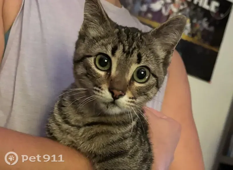 Es de color gris con rayas negras, ojos verdes y parece joven. Fue encontrada en la calle, maullando asustada. Aunque no tiene collar y no hemos podido comprobar si tiene chip (aún, los veterinarios hoy están cerrados), parece domesticada.