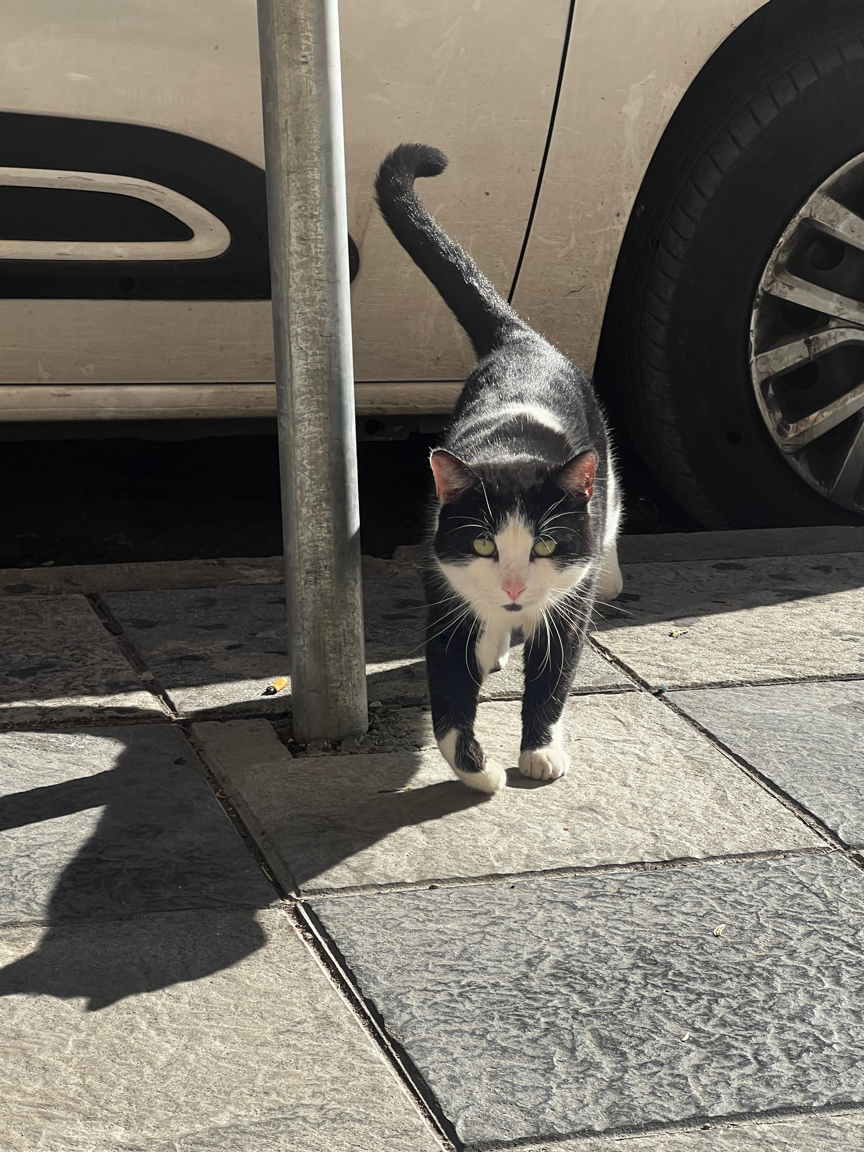 Es negro con blanco es muy bueno se deja tocar, no está castrado se le ve muy limpio y muy cariñoso lo encontré en la puerta de mi casa a las 9 de la mañana