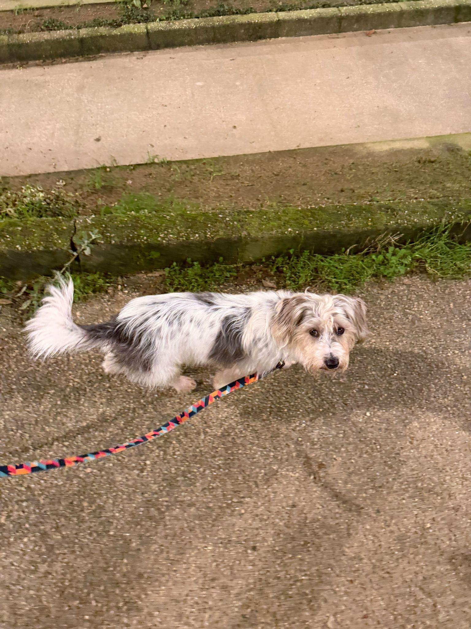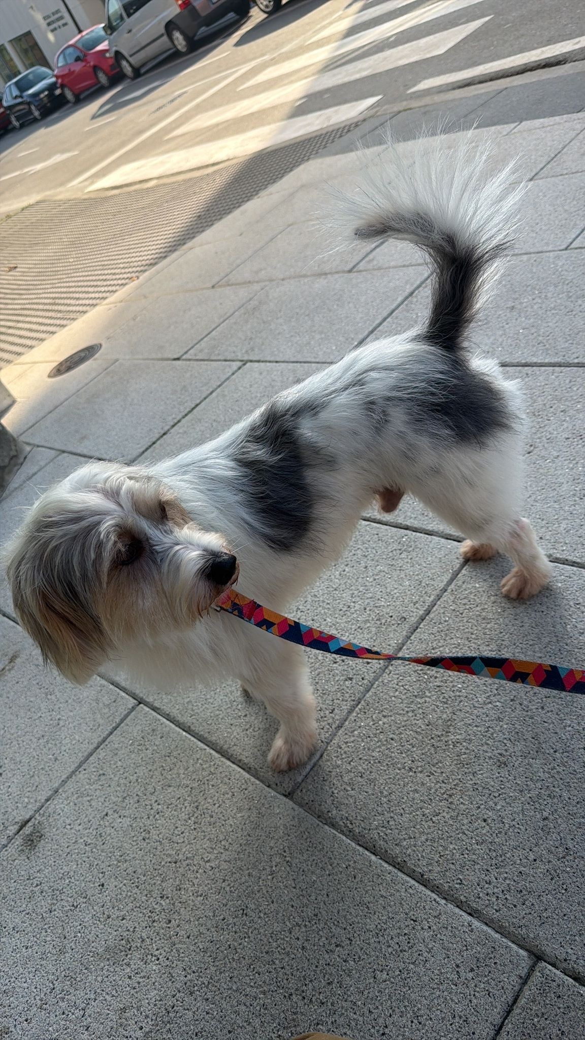 Perro de año y medio, 8 kg, acostumbrado a vivir en el monte. Tiene el pelo largo suave, de color blanco con manchas negras en el lomo y cabeza marrón. Recogido hace poco, no tiende a acudir a la llamada.