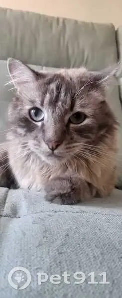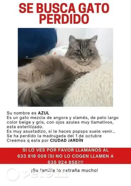 Nombre Azul, mezcla Angora y Siames, macho muy manso y asutadizo, con ojos azules , es muy llamativo, esta esterilizado, tiene tres años y se ha perdido por la zona de ciudad jardin la madrugada del 30 al 1.