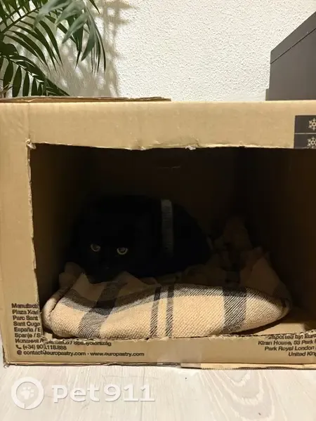 Hembra, color negro, ojos verdes/amarillos, encontrada en un parking después de meses maullando. La tengo en mi casa pero no me puedo quedar con ella por incompatibilidad con perros de la casa. Asustada, no sale de una caja, solo para comer y cagar. Creemos que ya estuvo en hogar.