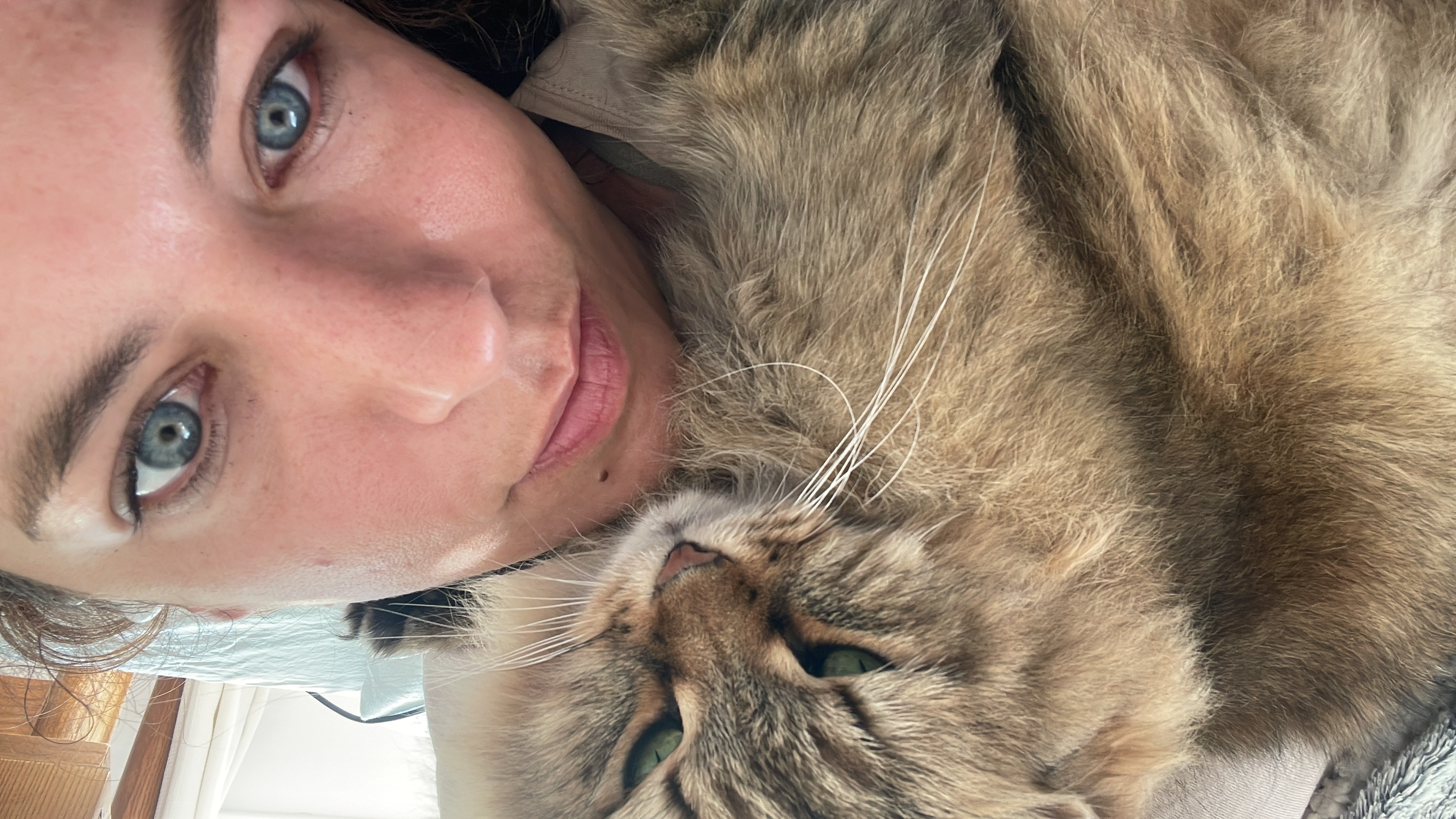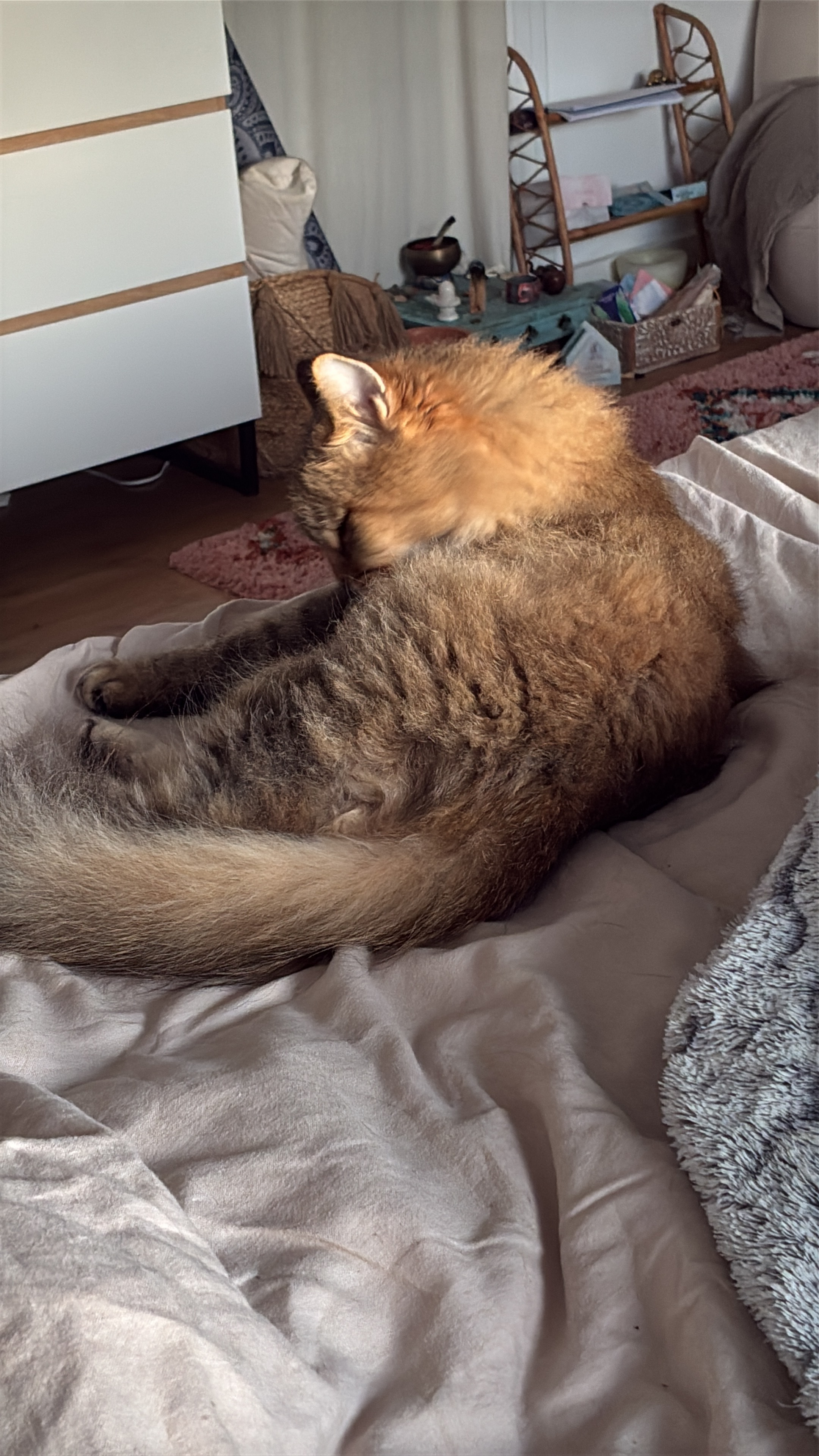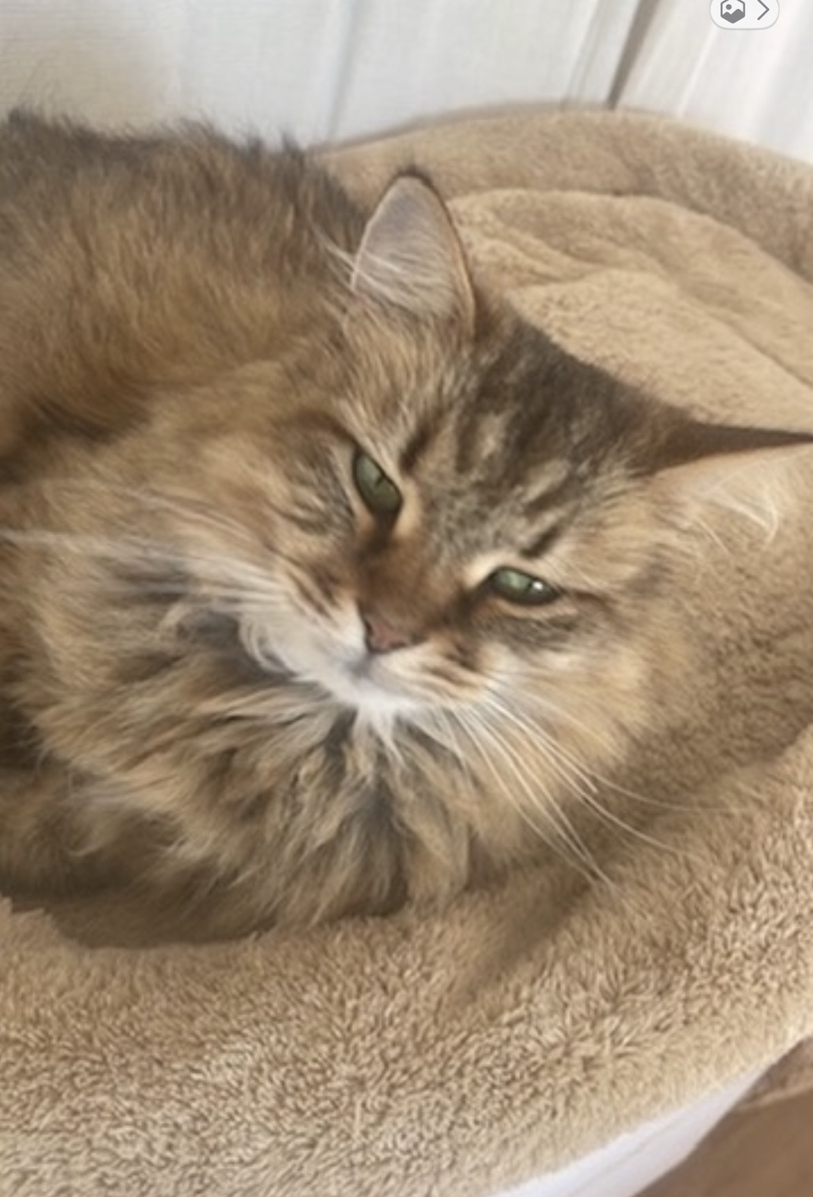 Es una gata grande Siberiana. No lleva collar pero si que tiene micro chip. Yo vivo en una finca cerca de la naturaleza y el parque de Collserola/al lado de Vallvidrera en la carretera que va hacia Molins de rei. Si la veis suele responder al tintineo de unas llaves. Para cogerla es mejor por el cuello.