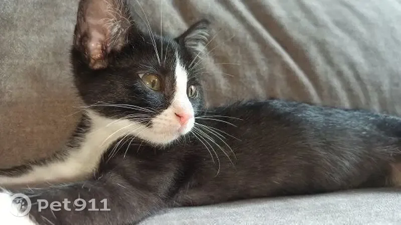 Gato negro con paritas blancas. Tiene 4 meses y es muy confiado y tranquilo. Se perdió en el barrio de La Pineda en la playa de Castelldefels. Lleva un collar beige con rayas de colores.