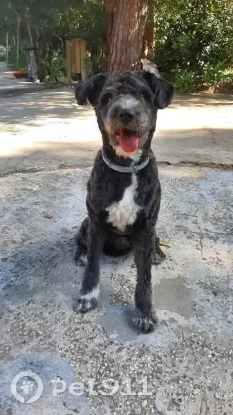 Perro de agua frances, pelo negro recien cortado, pecho y barbilla blancos, collar antiparasitario