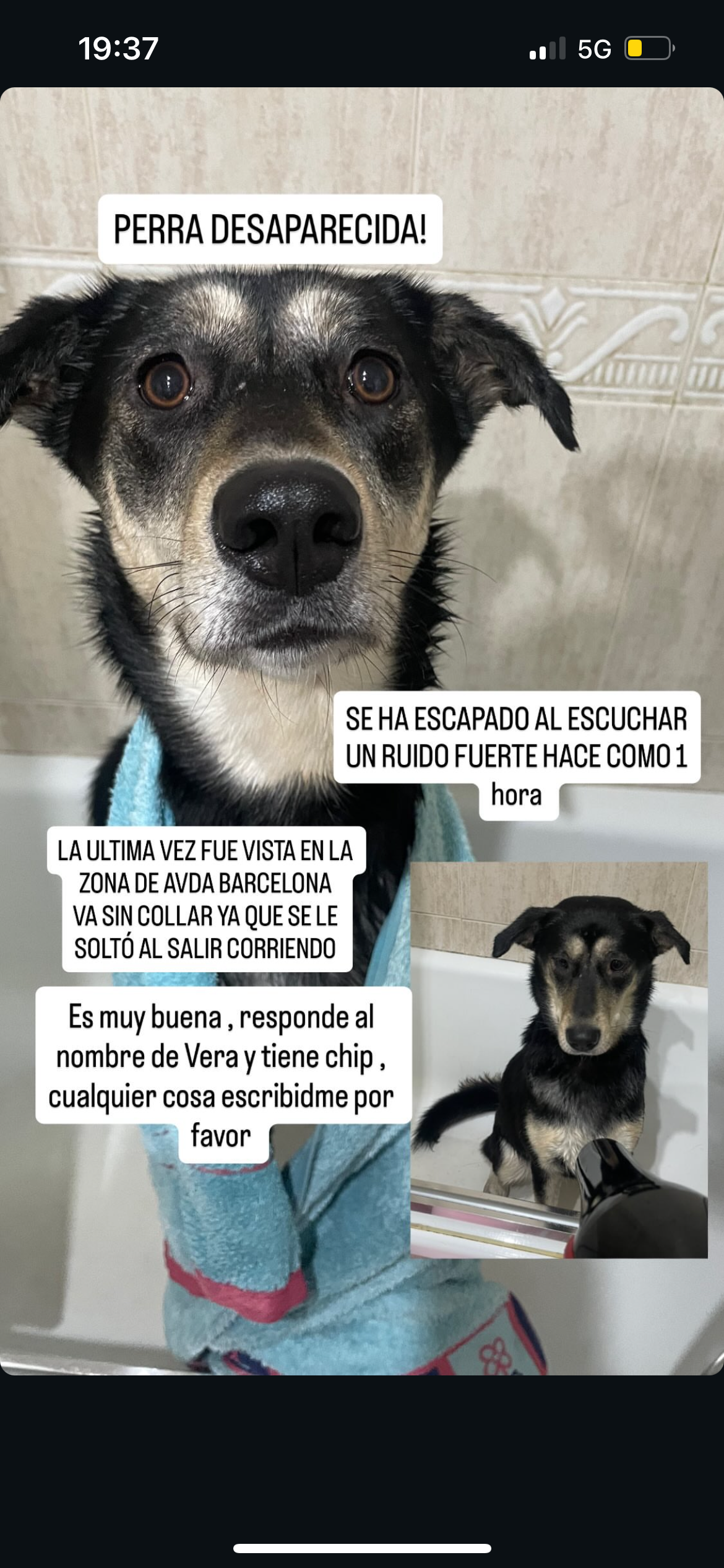 Tamaño mediano, negra y blanca, está asustada pero normalmente no tiene miedo a la gente, no tiene collar porque lo perdió cuando salió corriendo, tendrá hambre y estará cansada, con comida no debería de haber problema para cogerla