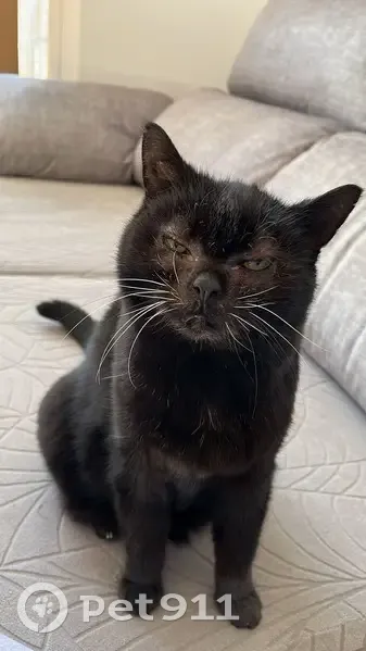 Es negro no muerde ni araña, si lo Intentas coger quizás no se deje pero si lo llamas vendrá Tiene problemas de piel y se le nota en los ojos Tiene los bigotes blancos