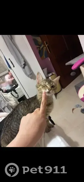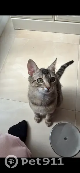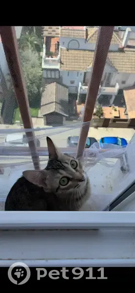 Gris atigrada clarita, ojos verdes, canijita, está en celo, es muy noble y cariñosa pero está asustada, anoche se me escapó sin querer por el césped de enfrente del Markos peluquero, porfavor necesito ayuda