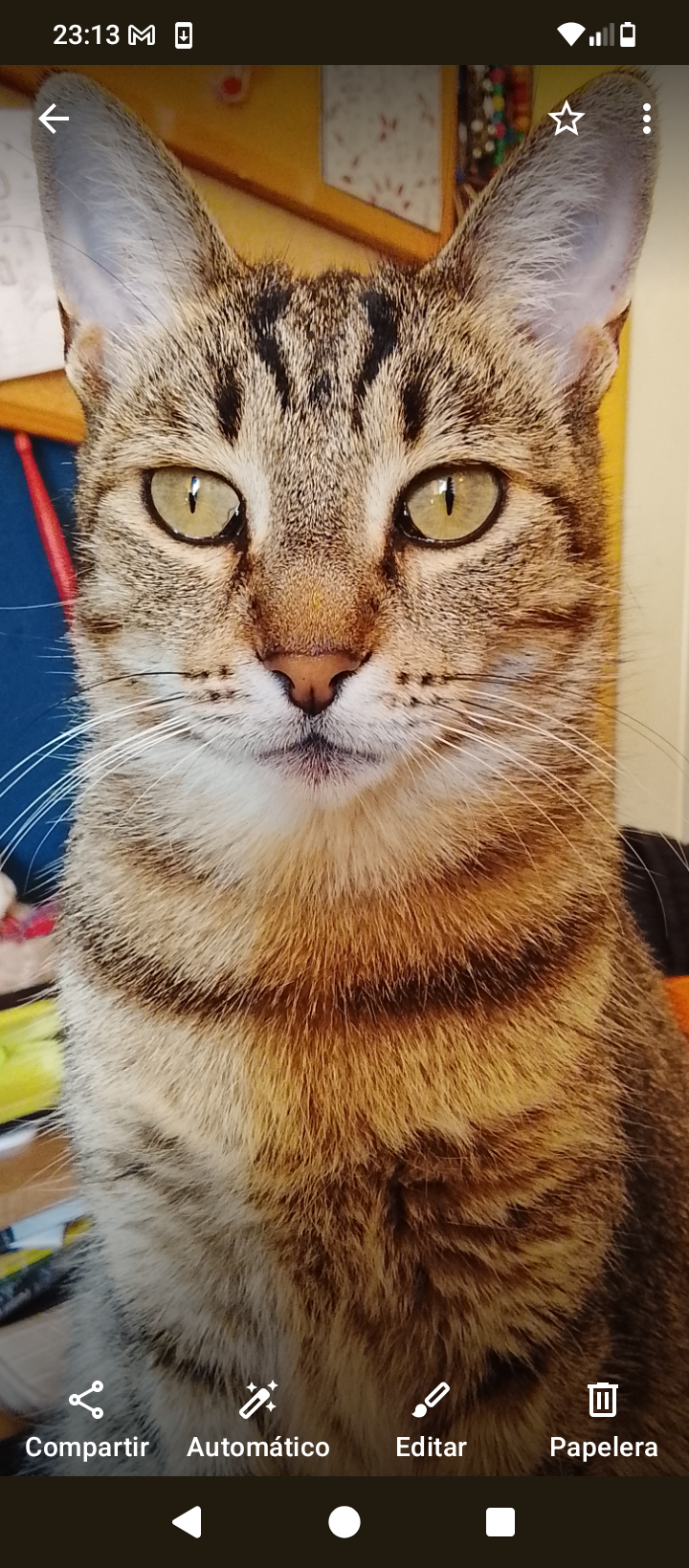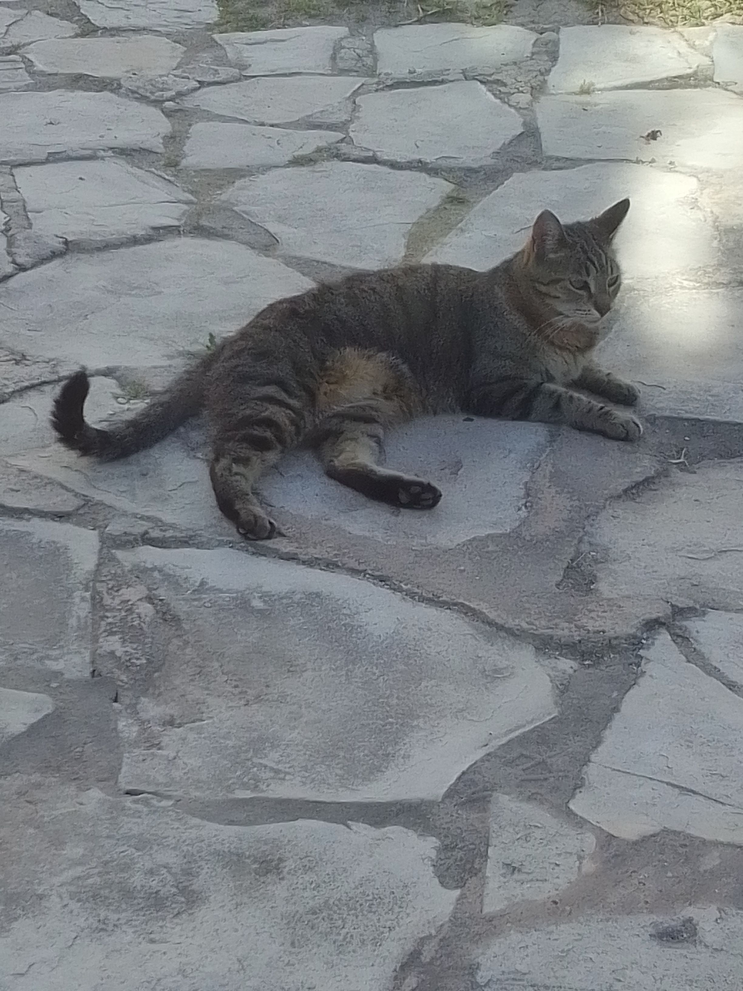 Es atigrada en tonos gis.,ojos verdes es sociable, me mudé hace poco mi casa da a una huerta, si alguien de la zona tiene terrazas o garaje sería de gran ayuda q echarán un vistazo.. Responde al nombre de Chuchi. Gracias Contacto 682666523