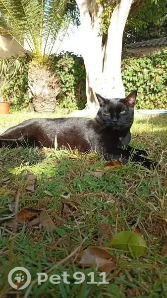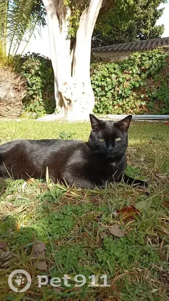 Negro grande y gordito con ojos verdes y dos manchas en el pecho y otra en la barriga. Le cuelga las lorzas de la barriga por los laterales al andar. El sale a las calle pero siempre por la zona y nunca ha estado más de un día sin volver. Puede que se haya quedado en algún sitio encerrado o que se haya metido en un coche por el frío y se haya ido a otro sitio.