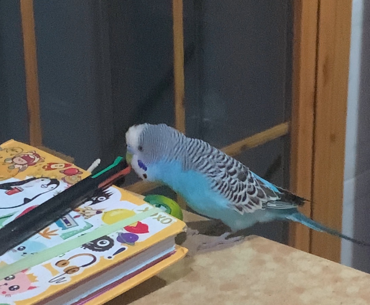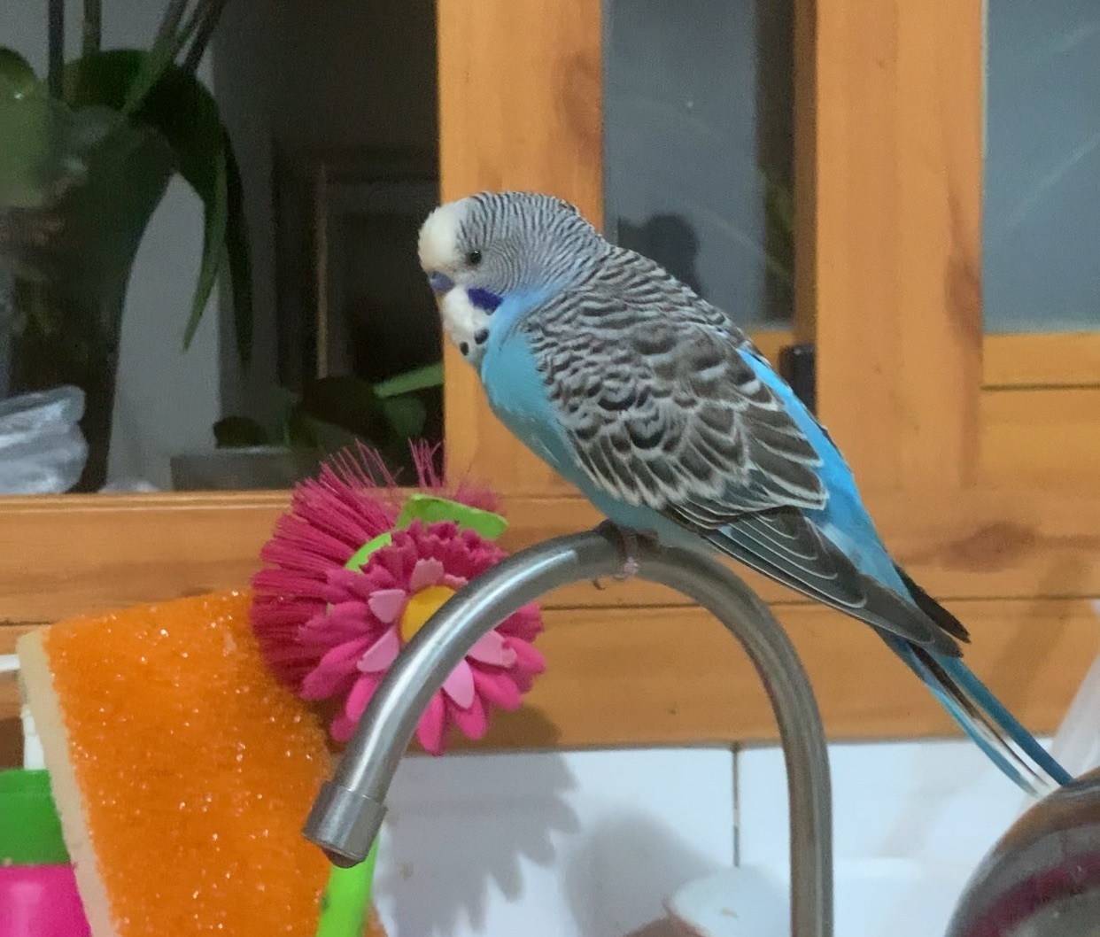 Es un periquito muy cariñoso, habla y se pasa el día dando besitos. Le gusta beber del grifo del agua. La cabeza la suele tener algo oscura de los besos q le damos