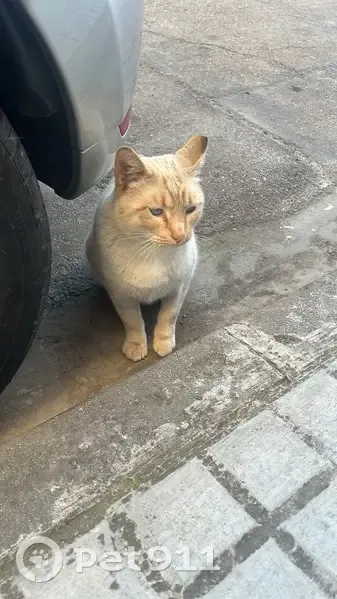 Ojos azules, blanco, parece haber sido abandonado, es un gato que siempre está en el mismo sitio y los vecinos le dan de comer y de beber, no tiene corte en oreja por lo que no parece estar castrado. Es muy sociable y cariñoso.