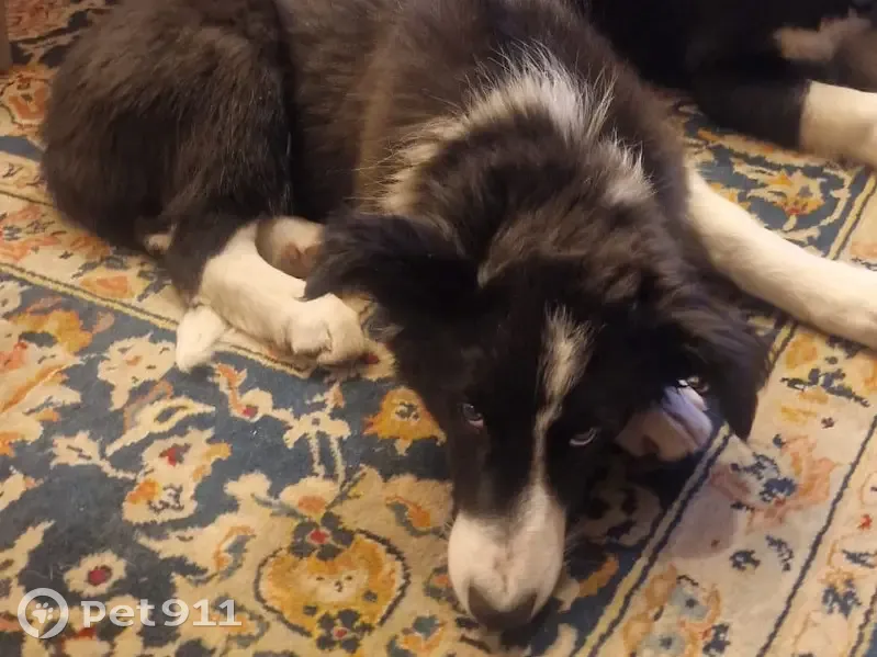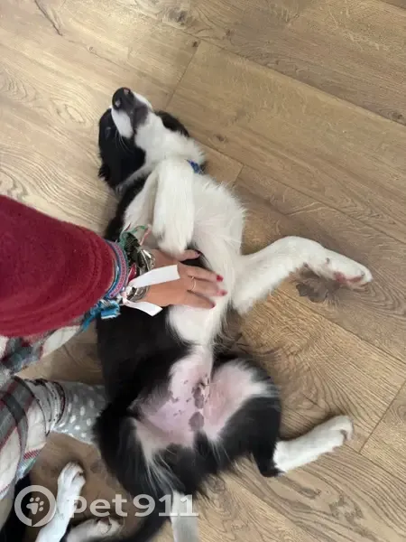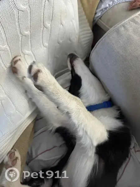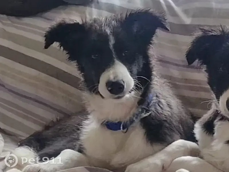 Es un cachorro macho border collie blanco y negro de 5 meses. Lleva collar azul y tiene chip. Suele tener una oreja más levantada que la otra. Estas son nuestras últimas fotos, tiene que estar más grande ya que crecen muy rápido.