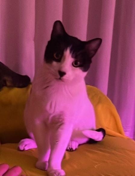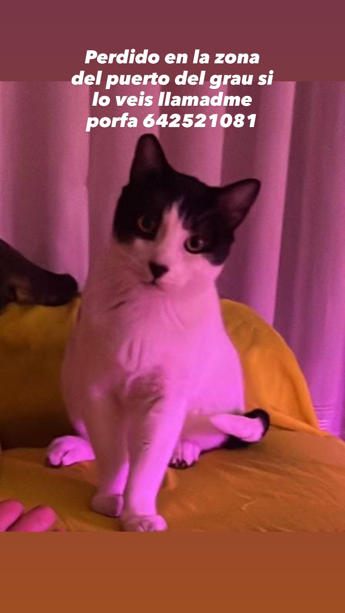 Es sociable, está castrado, tiene la punta de la cola blanca y tiene como en la cara como una mascarita negra y la boca blanca tiene seis meses puede ser asustadizo pero es sociable