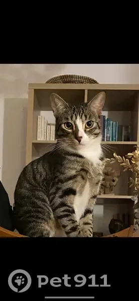 Tiene año y medio, de apariencia delgada, con rasgos atigrados y los ojos amarillos/verdes según la luz. Siempre sale por los patios cercanos un rato pero desde por la mañana no ha vuelto a casa.