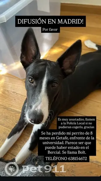 Desapareció enfrente de la UC3M, va sin arnés. Según dice la policía, el aviso que dieron fue que lo vieron dentro de la A-42 dirección Toledo/Parla. Es muy asustadizo y tiene 8 meses. Complicado de coger, por favor con movimientos lentos o con comida se dejaría coger.