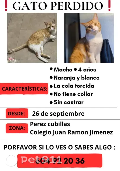 Tiene la cola torcida, no tiene ni collar ni chip, no esta castrado, puede que lo hayan visto por ma hispanidad cojeando, aunque no se si es el pero es parecido, sea donde veais un gatito parecido contactarme