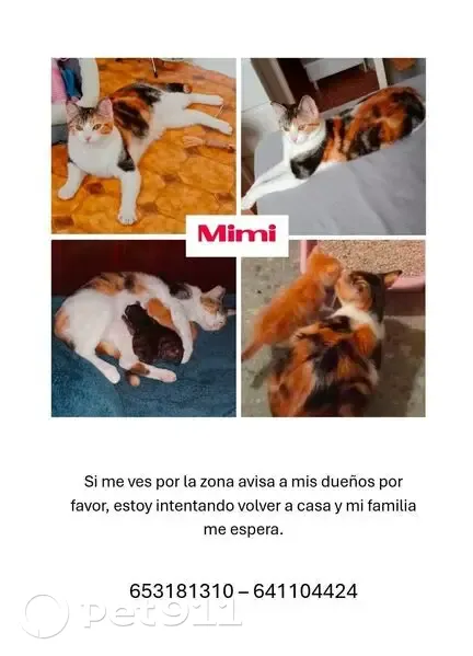 Gata tricolor, tranquila y curiosa, tiene una mancha negra en una de sus patas y un lunar también en una pata (almohadilla) Ofrezco recompensa.