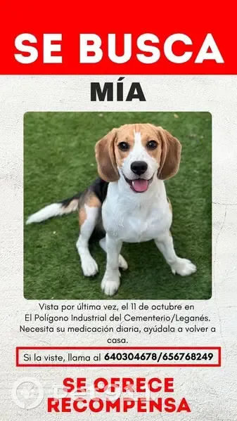 Mis es una Beagle relativamente pequeña de color blanco, marrón y negro. Estaba en ese escampado justo enfrente de la Residencia Geroplan El Encinar en Leganés cuando unos fuegos artificiales la alteraron y se fue corriendo, la pareja de mi hermana la perdió de vista a las 20:30 aproximadamente el día de ayer (11-10-2025). Por favor si la ven avísenme inmediatamente.