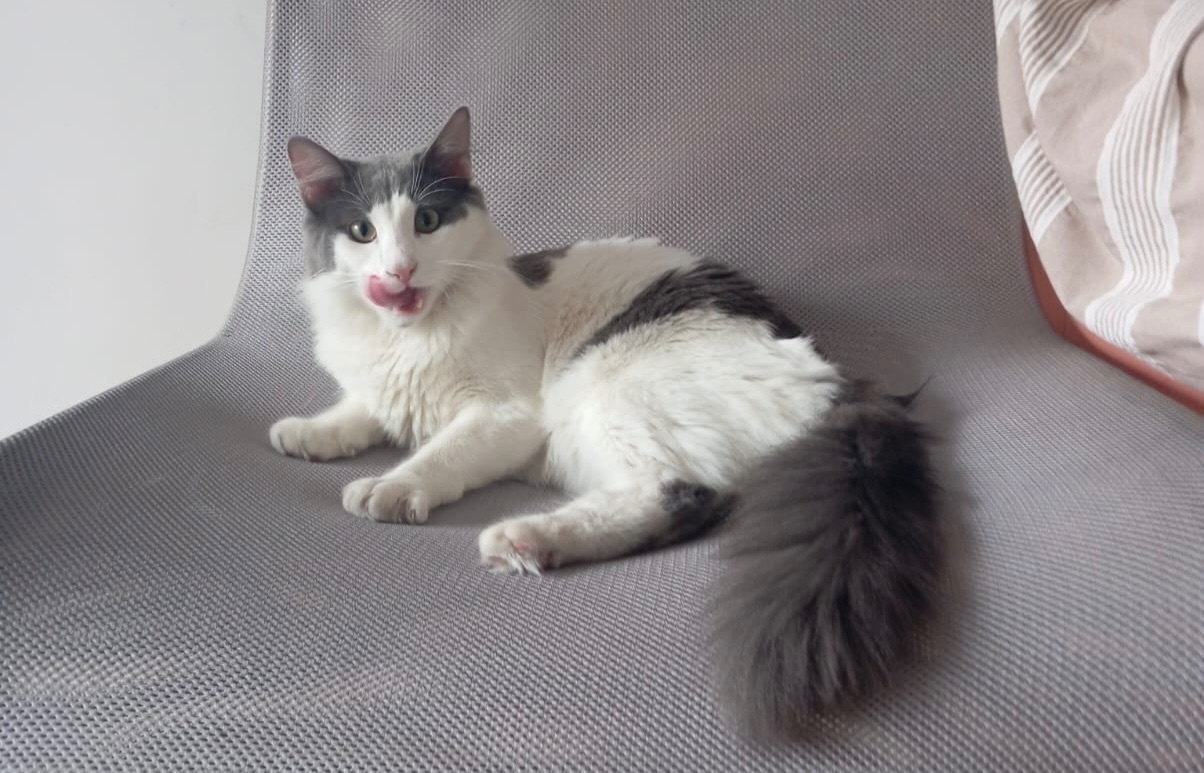 Gato blanco con manchas grandes grises, cola gris y ojos amarillos y verdes. Nos siguió al apartamento desde la calle. Subió el mismo las escaleras mientras nosotros estábamos en el ascensor.