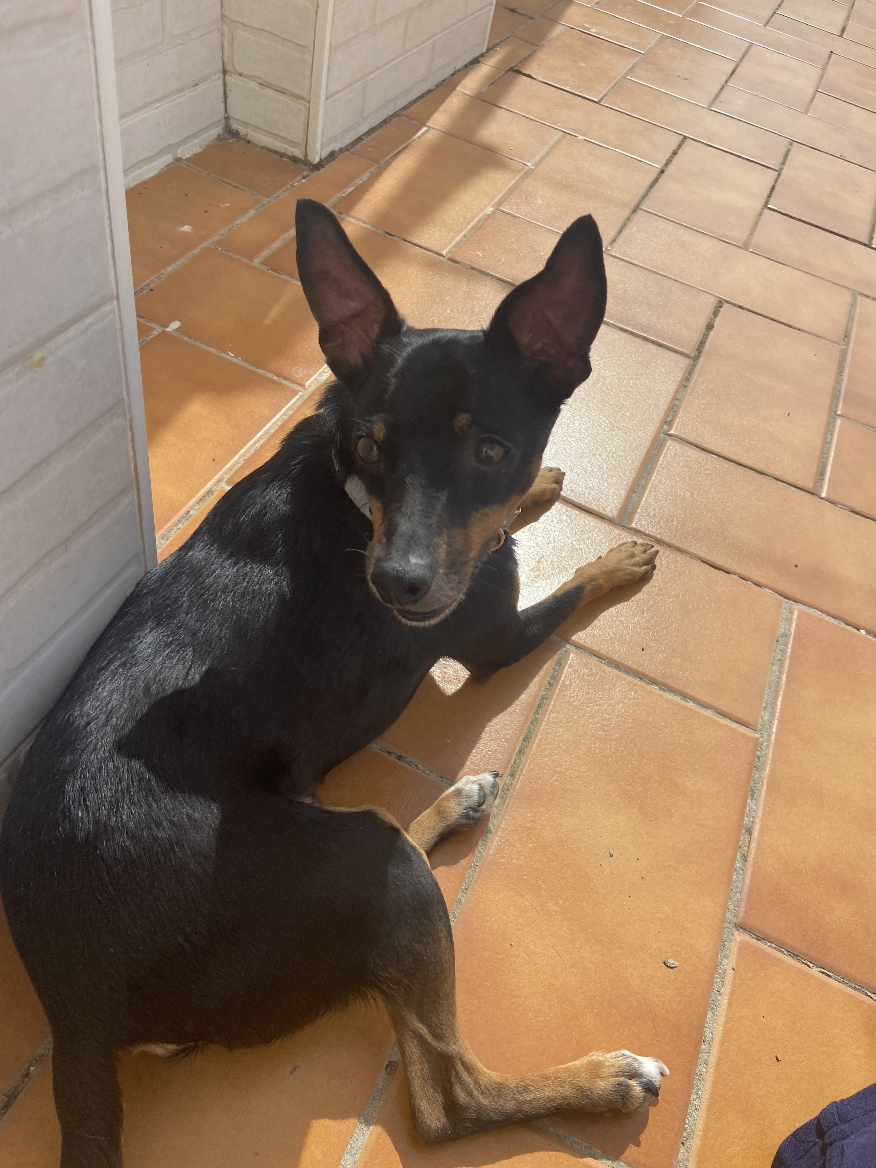 Es un pinscher tricolor, no es de raza pura, de un tamaño mediano/pequeño. El 5 de enero por la noche se escapó asustado debido a los fuegos artificiales.