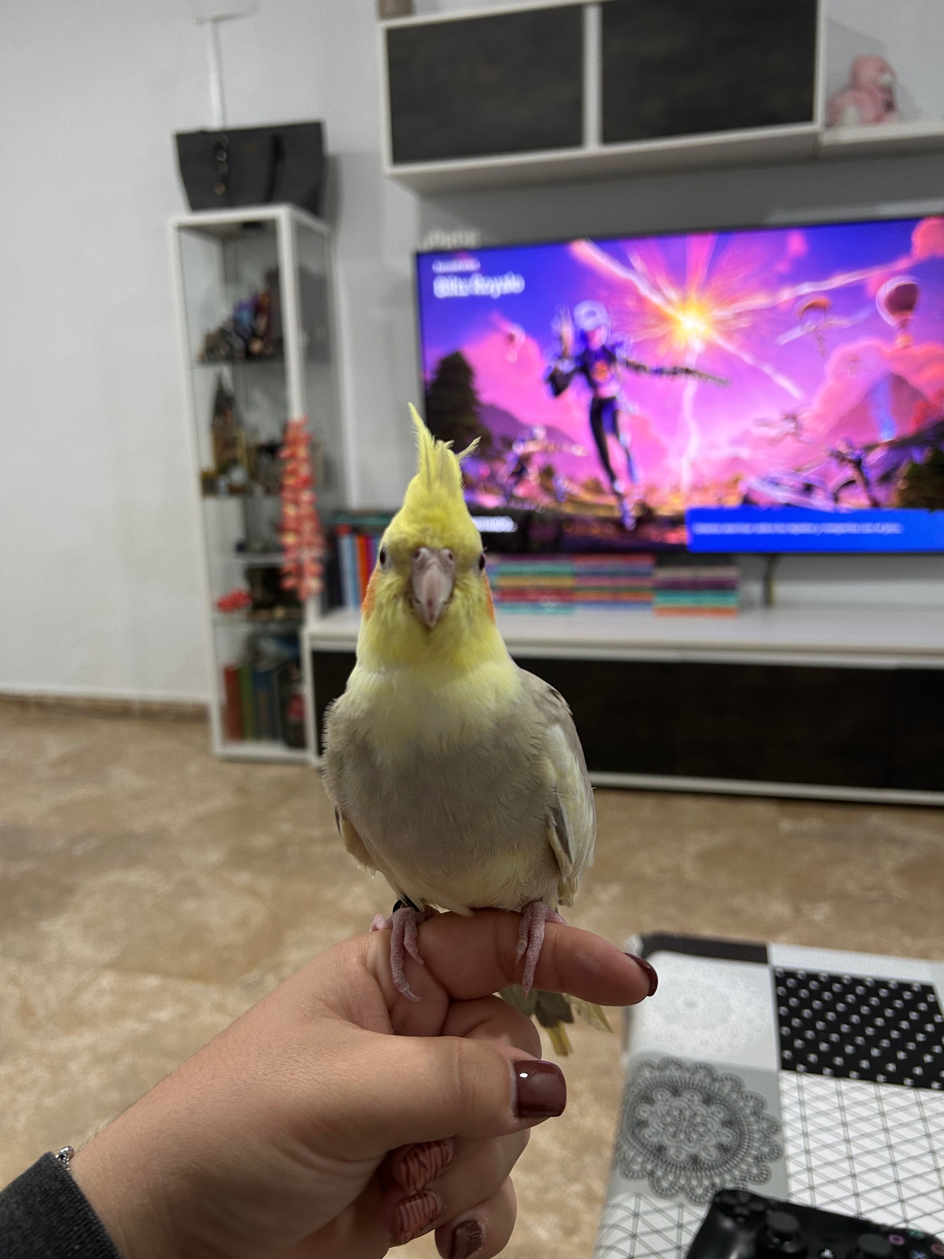 Es de color gris clarito y amarillo con los mofletes entre rojo y naranja. Está criado a papilla pero aún así no se suele deja coger de quien no conoce.