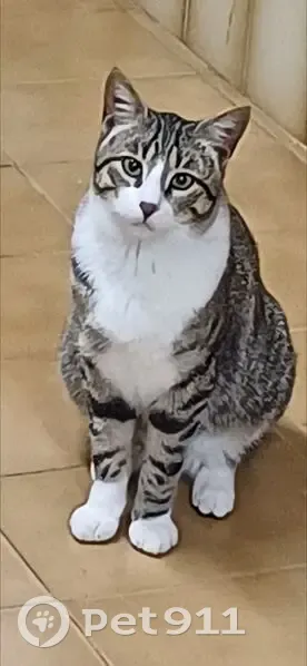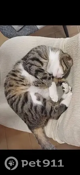 Color : rayas gris y negro, barriga y pecho blancos. Patitas botitas cortas blancas . Lleva microchip. Reacciona al hacer palmaditas y decirle " da mami papa al niño"