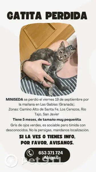 Miniseda tiene 5 meses y es muy pequeñita de tamaño. Es gris, con algunas rayitas, y ojos verdes. Es una gatita de colonia y llevaba poco tiempo socializada; es muy cariñosa, pero quizá desconfíe de las personas desconocidas. Responde a su nombre, a "minimini" y a los besitos en el aire. Si la ves, envíanos ubicación; si no acude a ti al llamarla, por favor no la persigas, para que no se mueva del sitio. Muchas gracias.