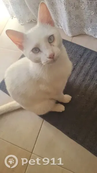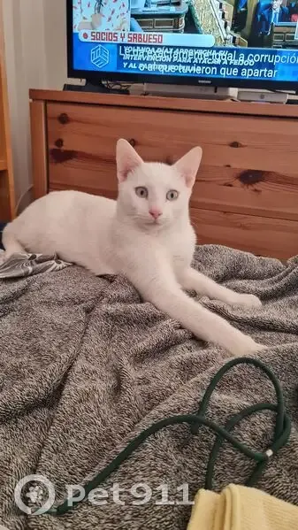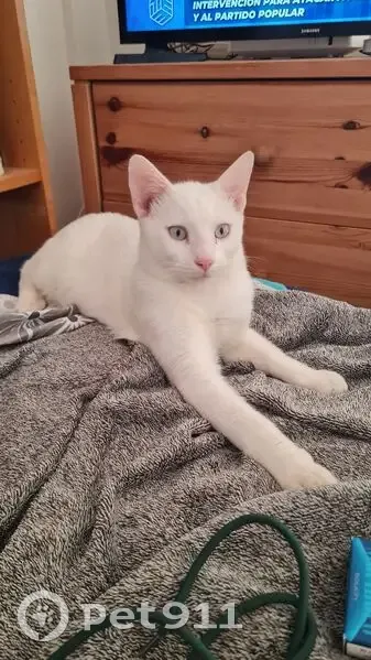 Es completamente blanco. De hecho el veterinario me dio una crema para ponerle. En las orejas y las patitas porque corre peligro de quemarse orejas y patitas. Es muy juguetón. Está castrado y lleva xip. APARECIO HACE JUSTO 3 MESES. Sin saber como llegó a mi casa (ático). Se lleva muy bien con mi perro de 14 años. Come de su bolsillo al lado del perro y se respetan sus comidas. Por las noches sale a la terraza y juega con cualquier cosa que encuentre. Sobre las dos o las tres de la madrugada se sube en el sofá junto al perro o a mi cama y me ronronea haciéndose su camita. Así como llegó se fue. La. Noche del martes hubo una. Fuerte tormenta y ya no vino a dormir. He preguntado a todos los vecinos y nadie le ha visto. Hace tres meses que esta en casa. Quiero y deseo pensar que está con alguien que le encontró asustado. He tardado en reaccionar porque pensaba que en dos días aparecería. Pero por desgracia NO HA SIDO ASÍ.