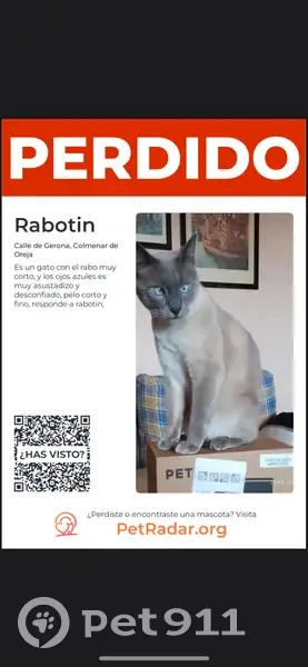 Busco a mi gato Rabotin, es una gato macho de color gris claro con las patas y la cara mas oscuras, ojos azules y cola muy corta. Es muy asustadizo con desconocidos y seguramente huya al verte,