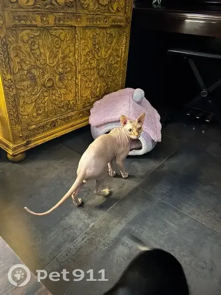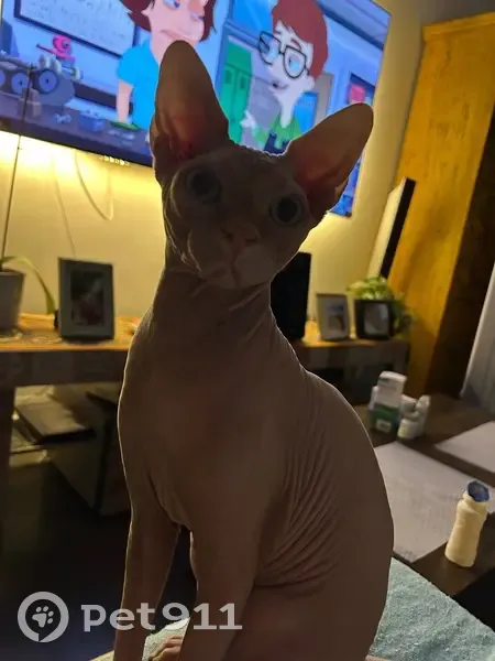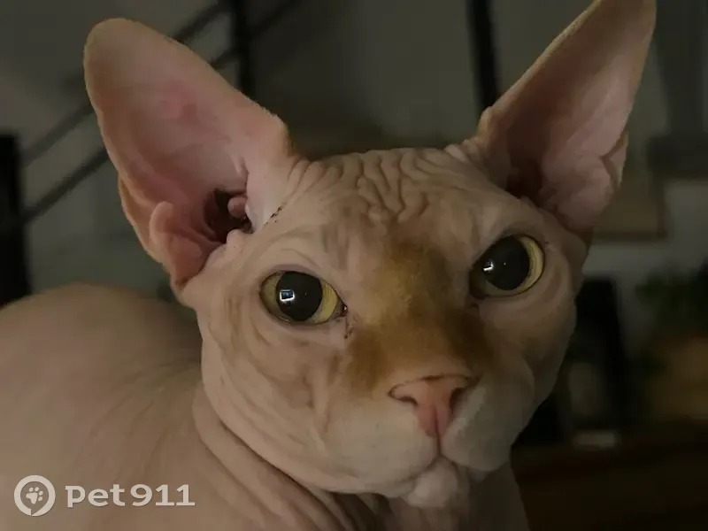 Es de raza Egipcia (sin pelo). Está castrado, pesa 4kg, tiene ojos amarillos y lleva Chip.