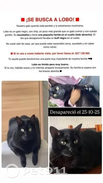 Zona: Urbanización Royal Park, Gualba — Calle Alfonso X el Sabio, 233 Lobo es un gato asustadizo y poco Sociable, por lo que podría esconderse si alguien intenta acercarse. Lleva puesto un buff negro y tiene una herida visible en el lado derecho del cuello, es gordito y grande, mucho más de un gato normal. Si lo ves o tienes alguna noticia, por favor contacta inmediatamente: 637 138 085 Avisar de su ubicación si no hay manera de cogerlo. ¡Su familia lo está buscando con mucha preocupación!