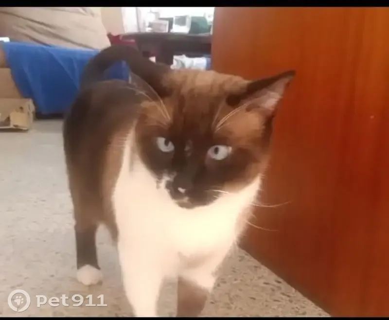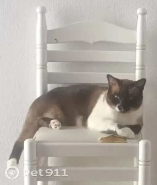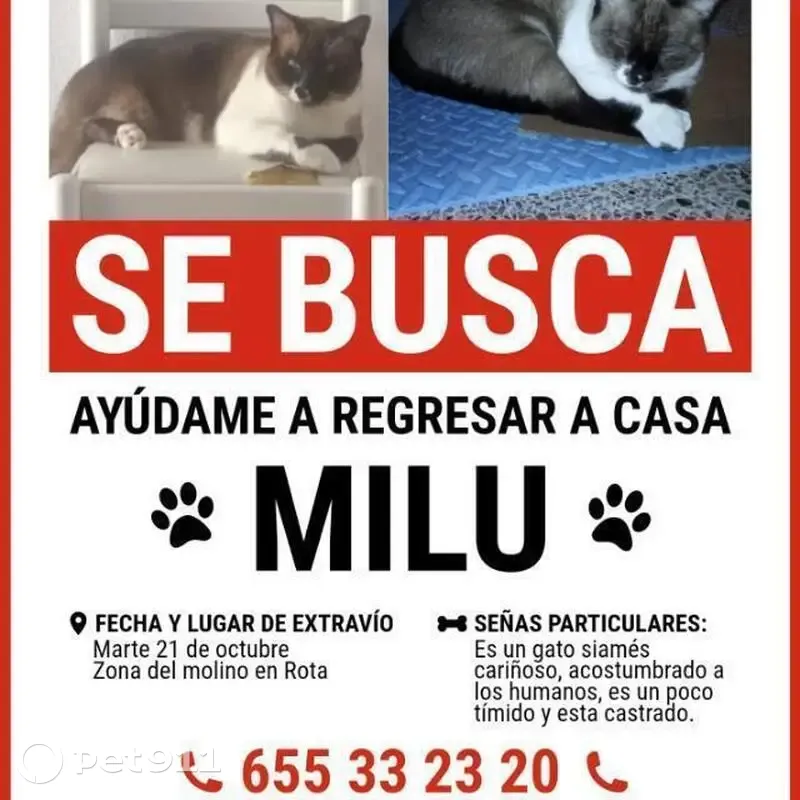 Es un gato siamés blanco y marrón, la cabeza la tiene oscura pero con unas manchitas blancas en la nariz. Ojos azules, un poquitín bizco. Salió por una ventana que dejo abierta y ya no volvió