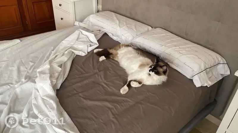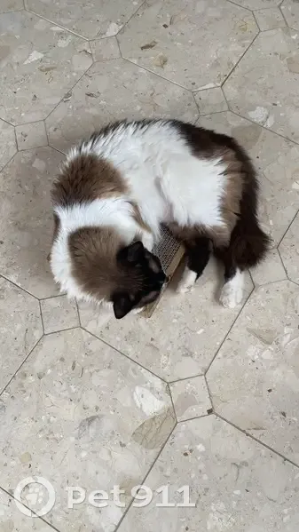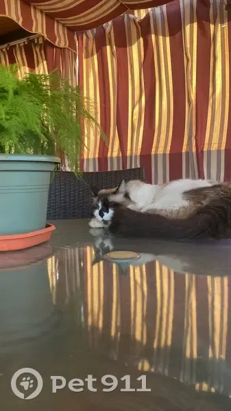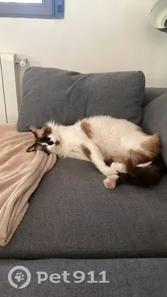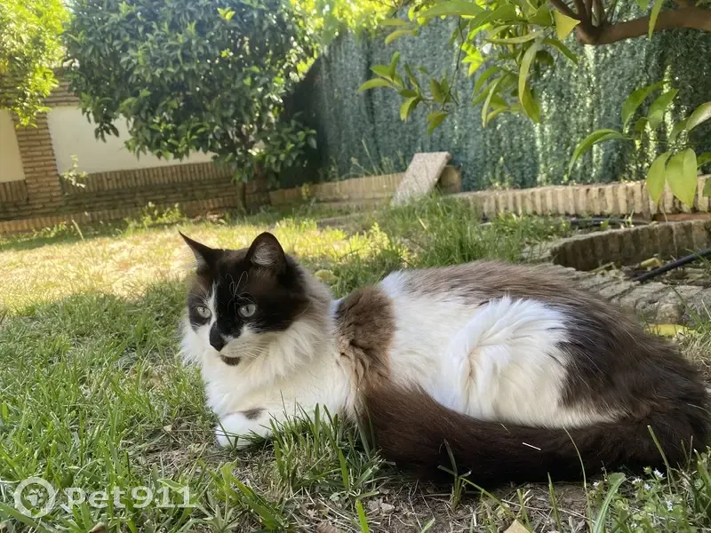 El gato tiene pelo semilargo, de color blanco y marrón, a manchas. La cara y las orejas las tiene mas oscuras, y el rabo es muy peludo. Tiene tamaño mediano-grande, cuerpo alargado. Ojos azules o verdosos. Tiene una mancha en la cara muy especial, que rompe su simetría. Salió por la ventana de la casa y nunca más lo hemos vuelto a ver. Suponemos que saldría por la valla de la parcela y se perdió. Esto ocurrió entre las 5 y 6:30 de la mañana del viernes 7/11/2025