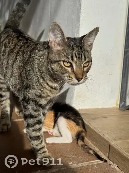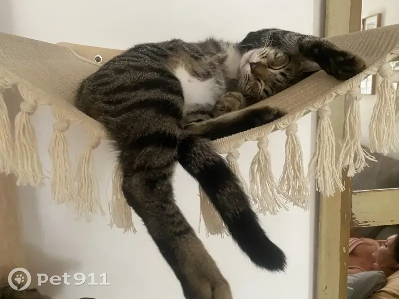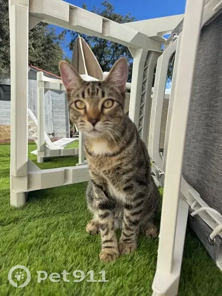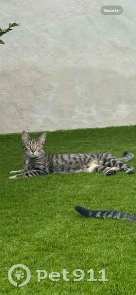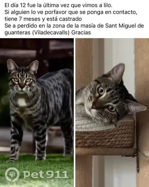 Es un gato de 7 meses, está castrado y siempre sale a pasear junto a su hermano, se daban unas vueltas y al llamarlos siempre volvían ya que es una zona verde donde no pasan los coches. El es muy sociable, va con el rabo bien tieso, en el pecho y en la barriga tiene una mancha blanca.