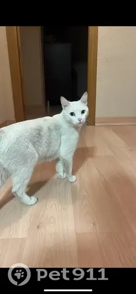 Es blanco entero,es más o menos cariñoso no tiene mucho miedo de la gente ni de nada es mediano