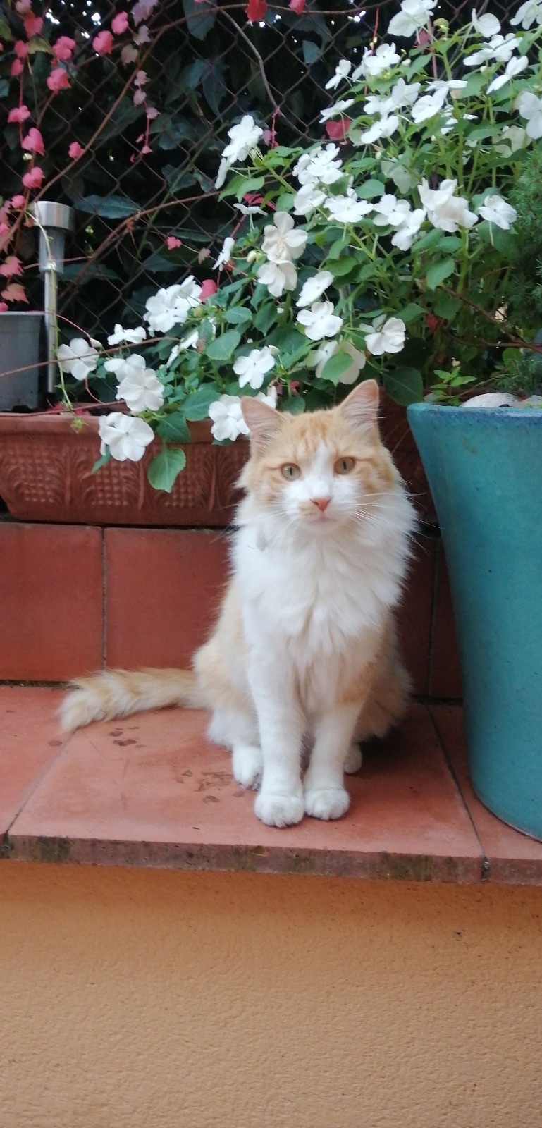 Gato naranja y blanco de pelo largo, bastante grande de tamaño. Es bastante desconfiado con desconocidos y con mucha energía (tiene chip). Necesita medicación y se ofrece recompensa.