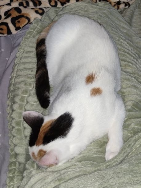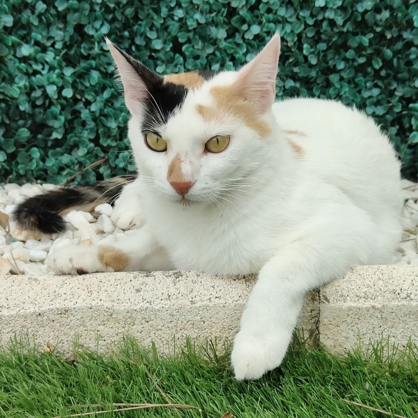 Gata blanca tricolor, con una oreja negra y otra marrón, dos manchitas marrones en la espalda y la cola negra y marrón. Tiene un año, asustadiza, salió al jardín y no ha vuelto a aparecer.
