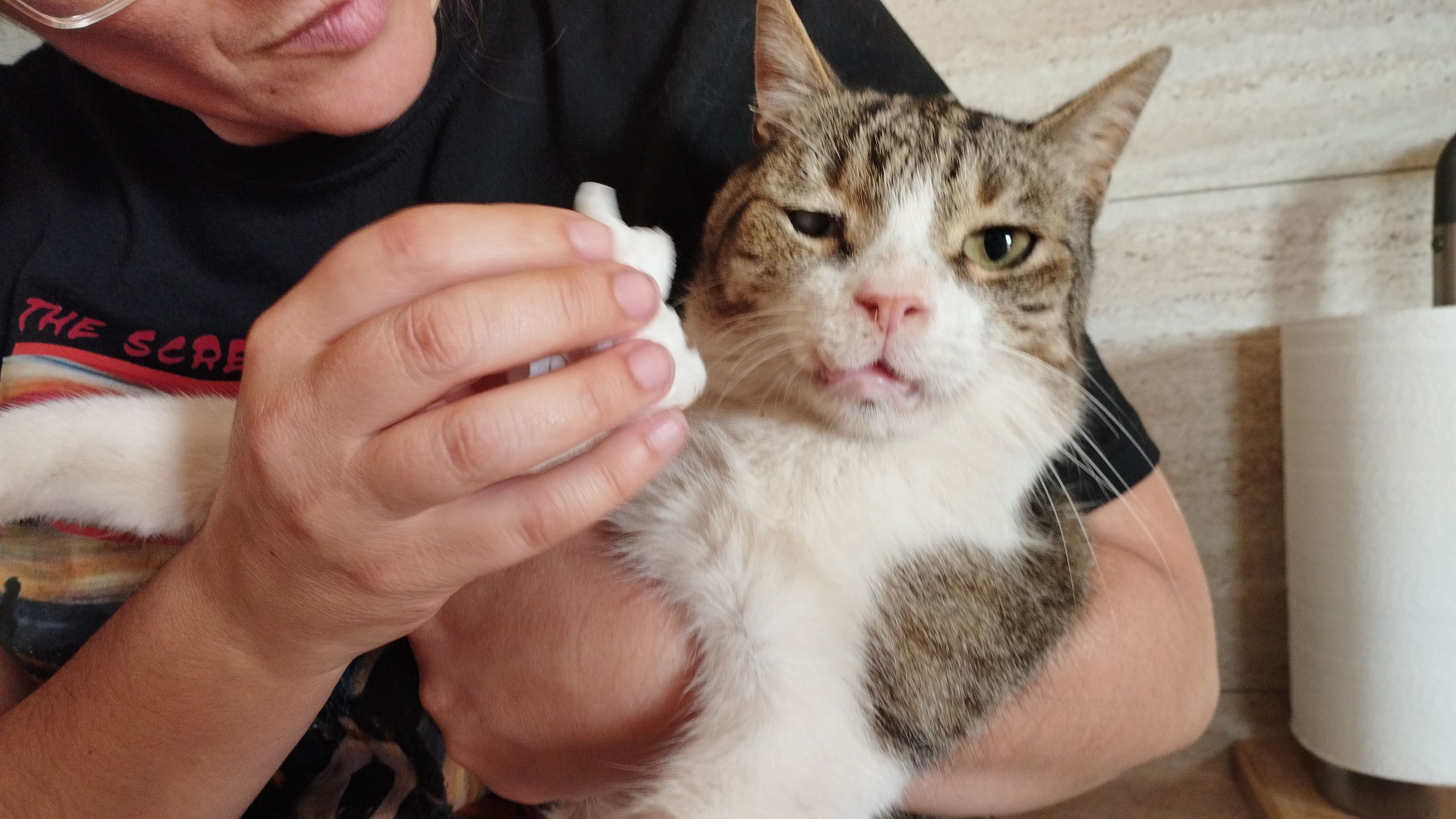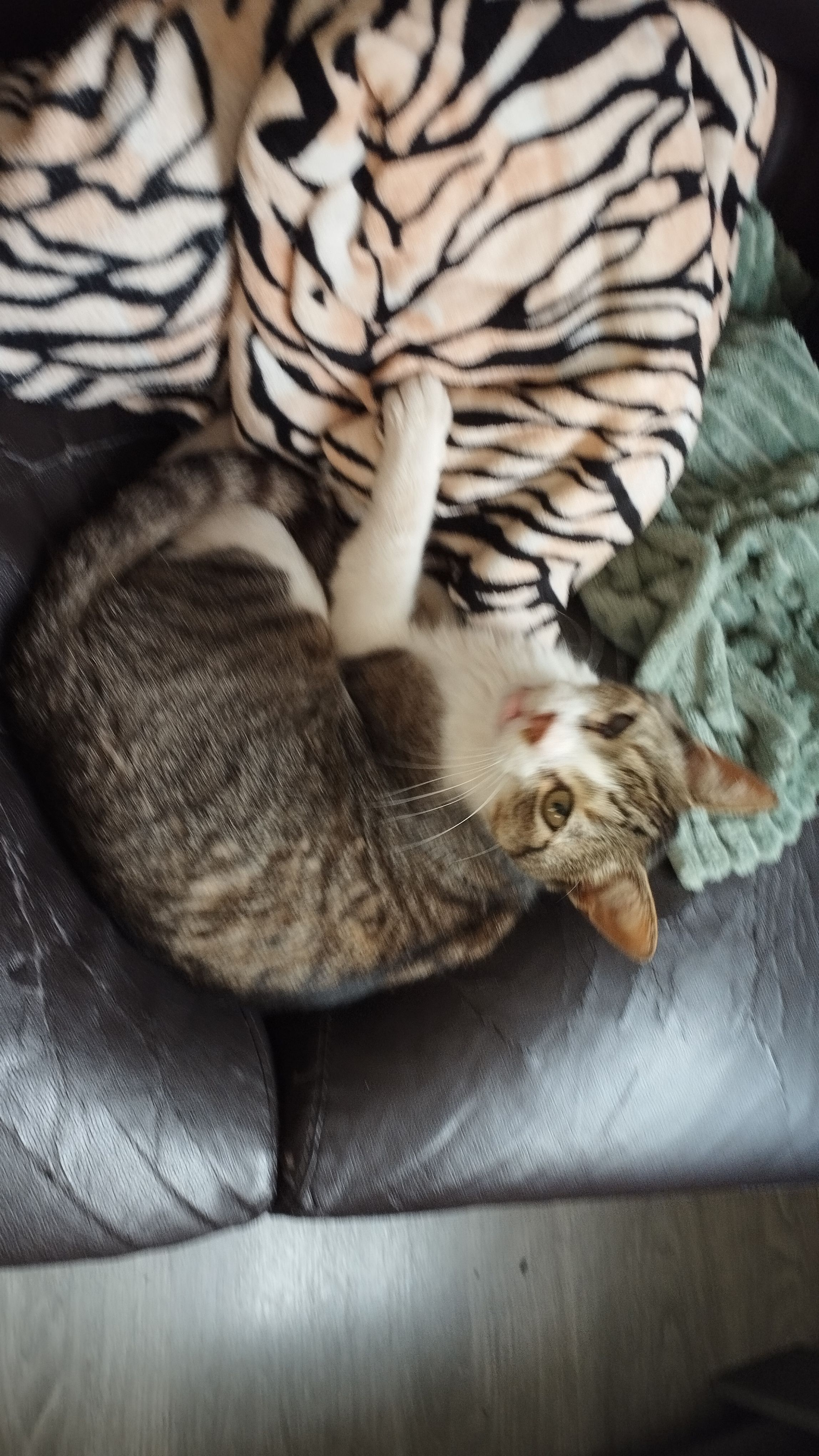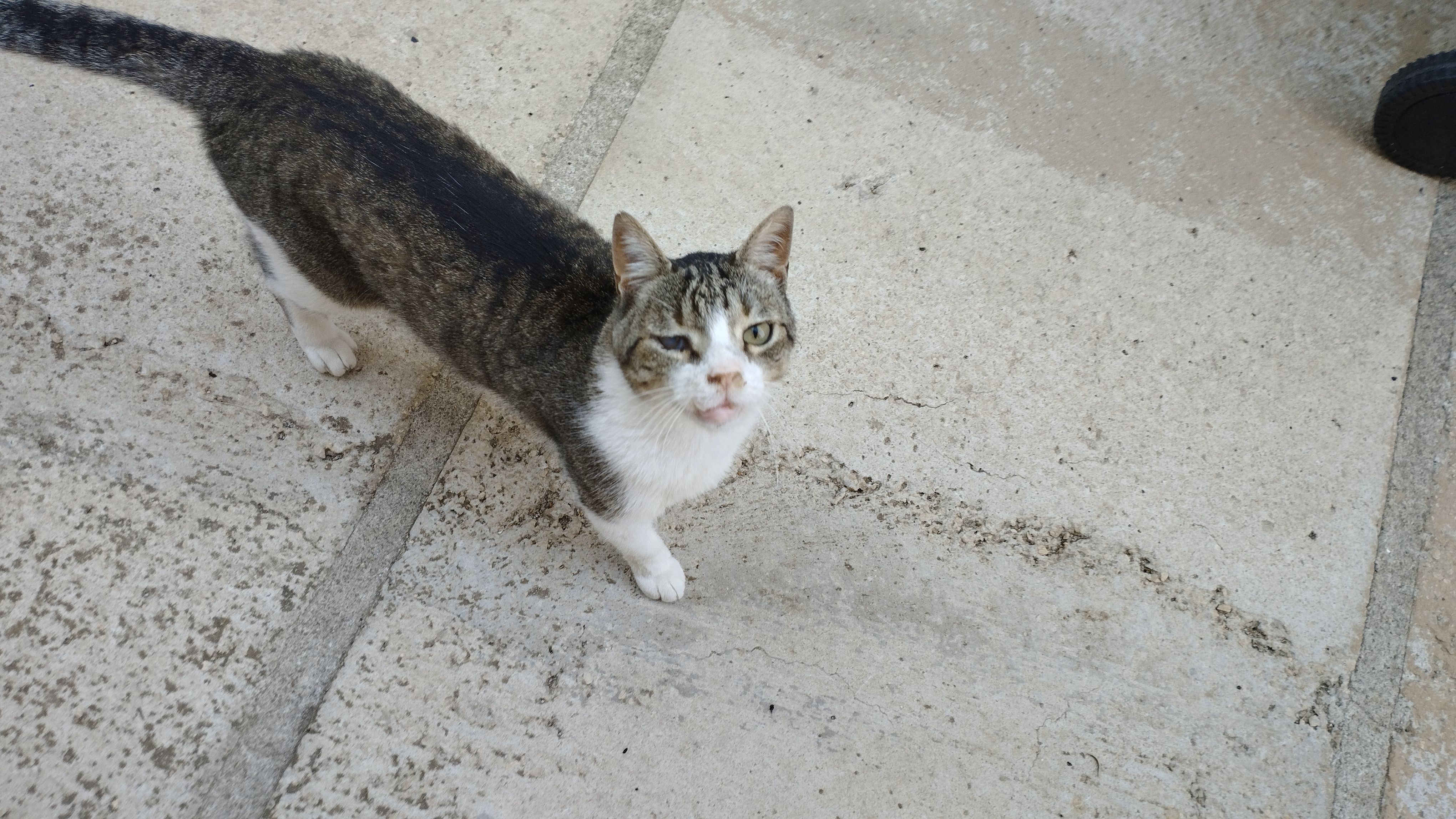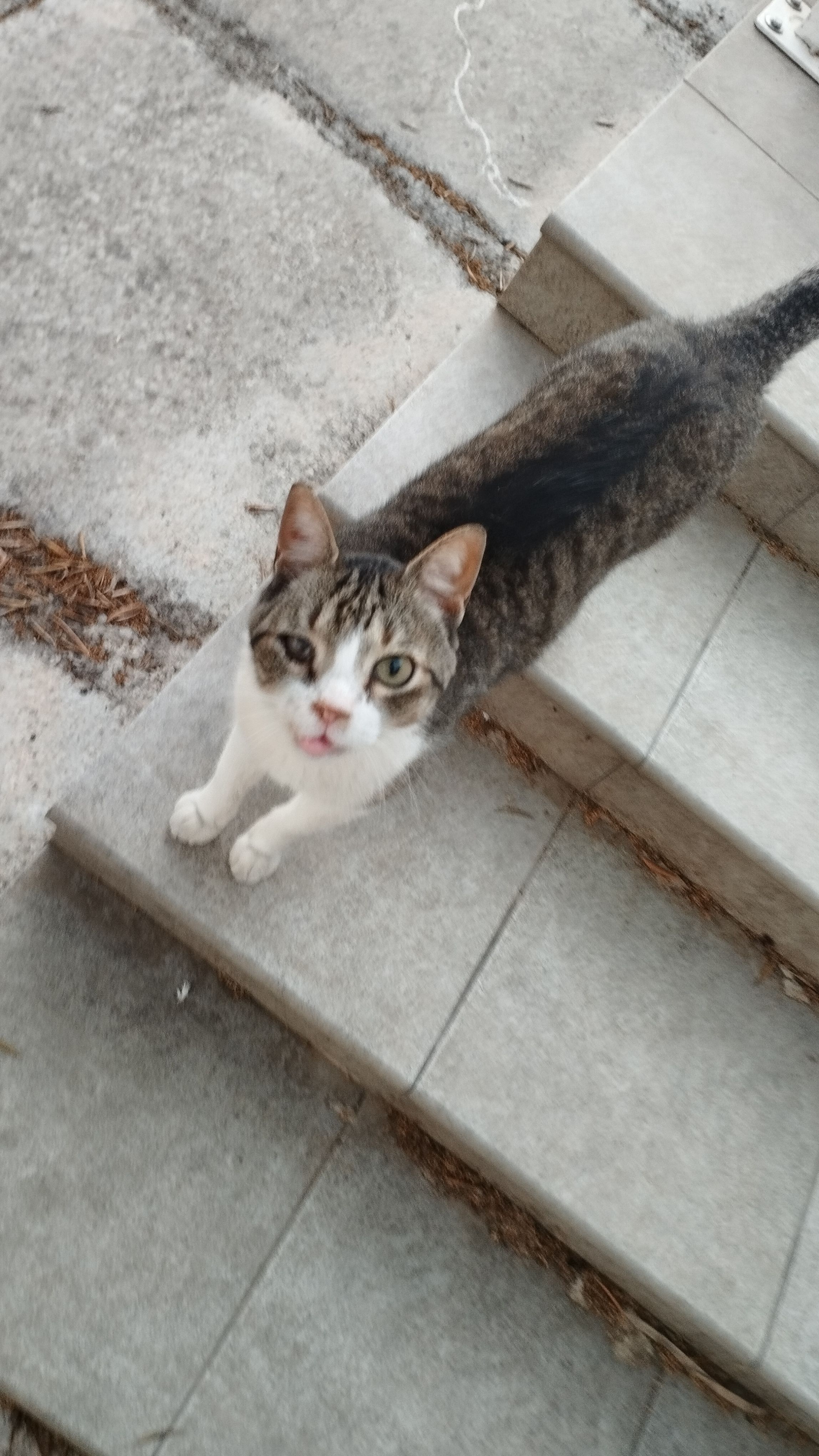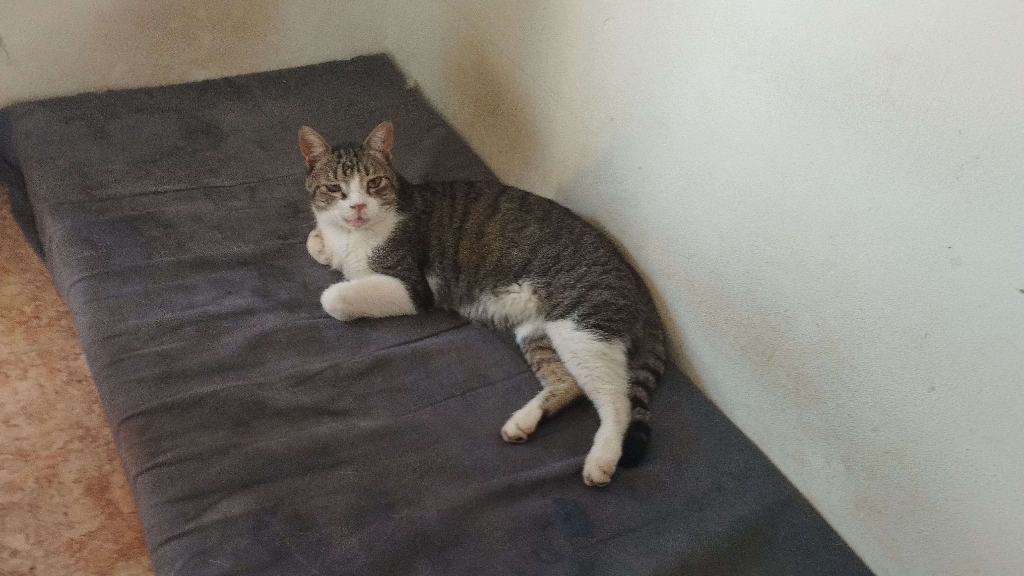 Color blanco con manchas atigradas grises por todo el cuerpo. Ciego de un ojo, colmillos de abajo salidos o hacia afuera, por un accidente, en la mandíbula de abajo debajo de la lengua se puede ver qué tiene unos hierros braquet que le pusieron desde el accidente que tuvo. Tiene ahora ya 5 años, cuando desapareció tenía 4, cumplio los 5 en octubre. Es macho, castrado. Es muy cariñoso, le encanta el jamón, lo vi en casa por última vez la noche del 12 de agosto de 2025, lo quiero mucho y estoy muy preocupada por el, apreciamos cualquier información, muchas gracias.