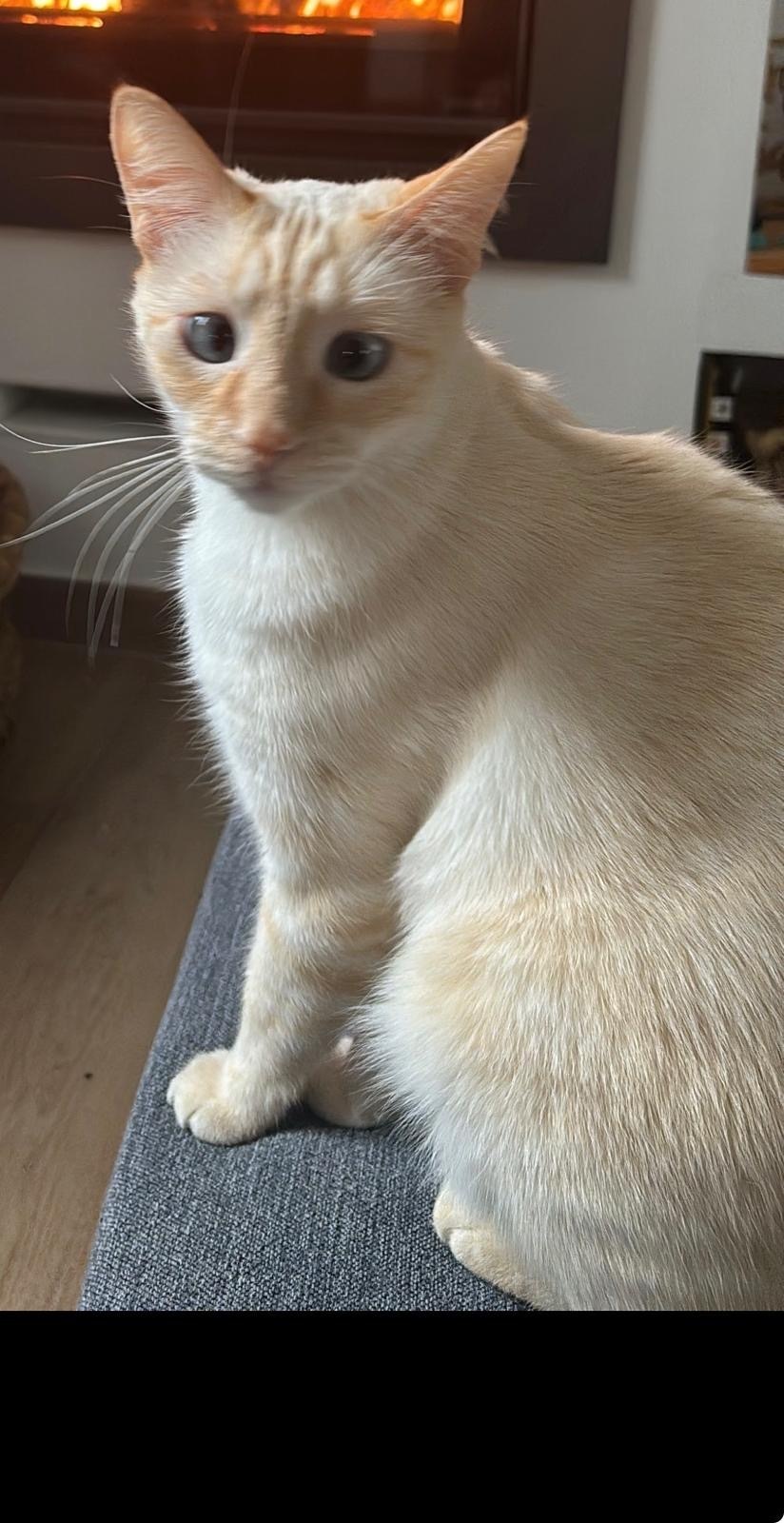 Color blanco con ojos azules. Una característica importante es que no tiene dientes. Es muy bueno y es posible que se fuese por la terraza a otros tejados de la zona.