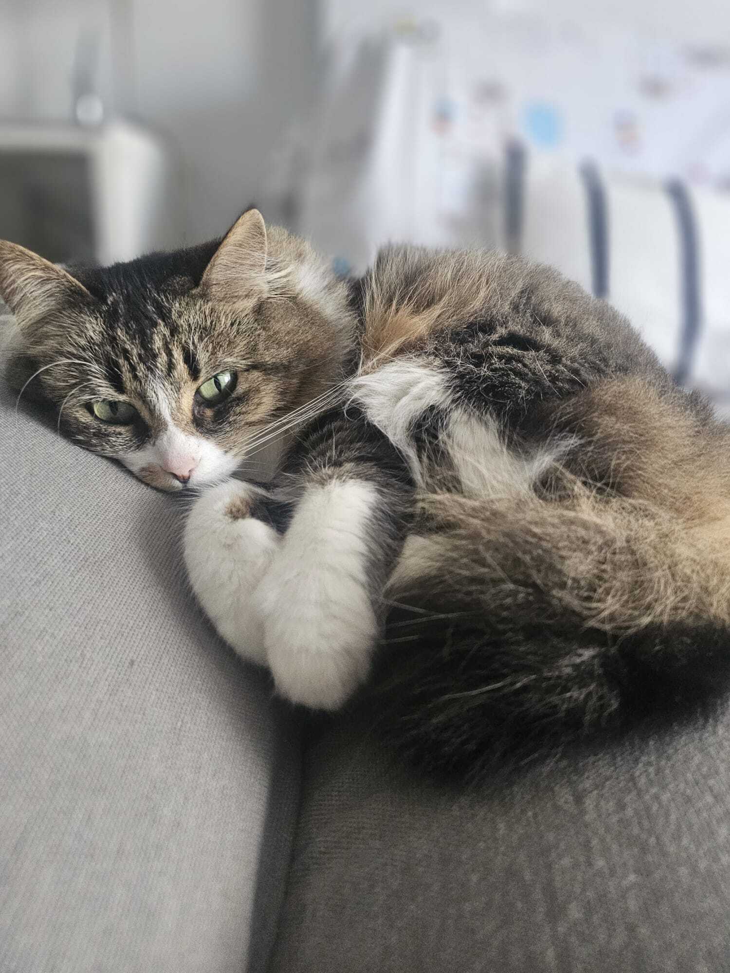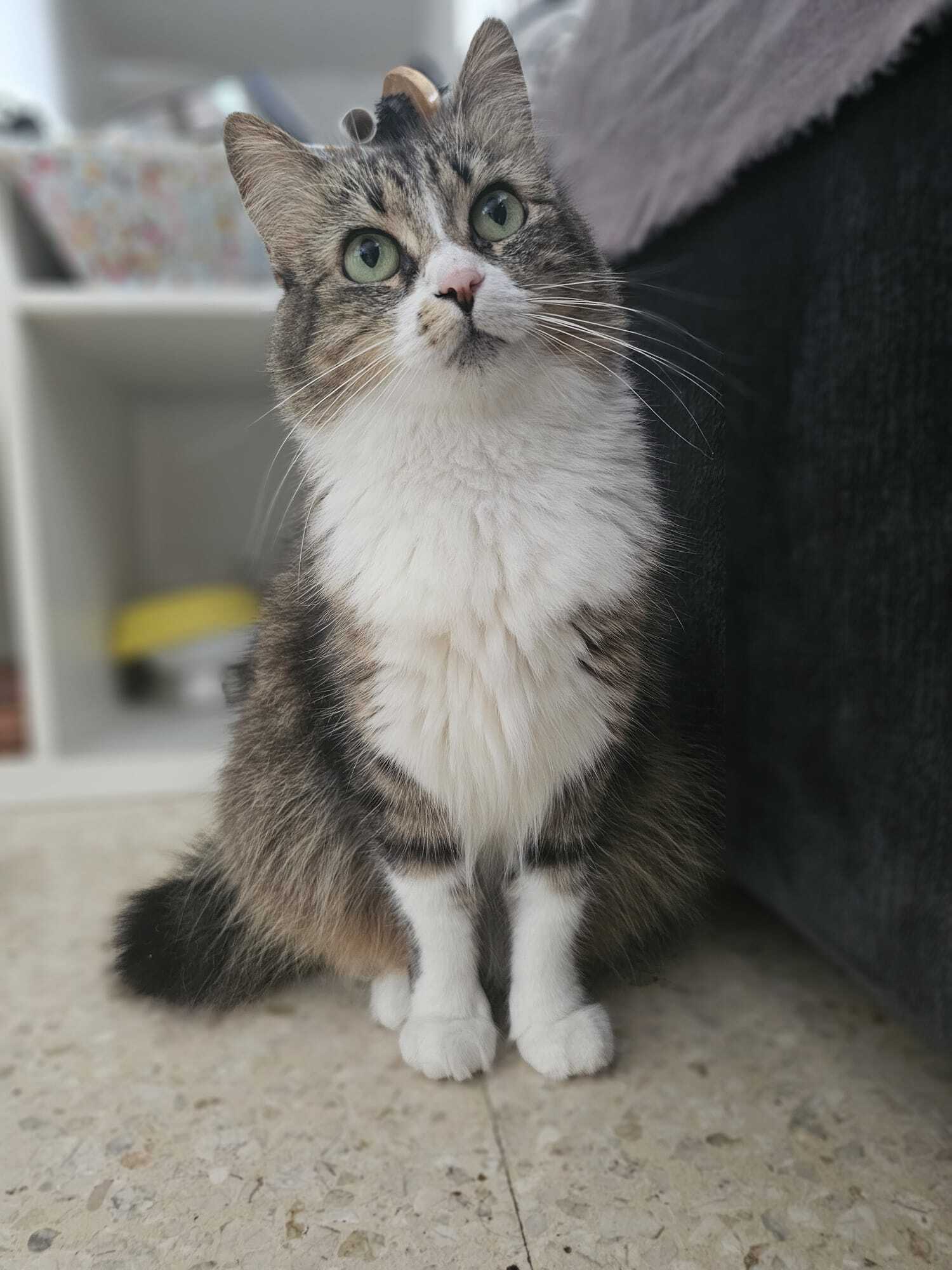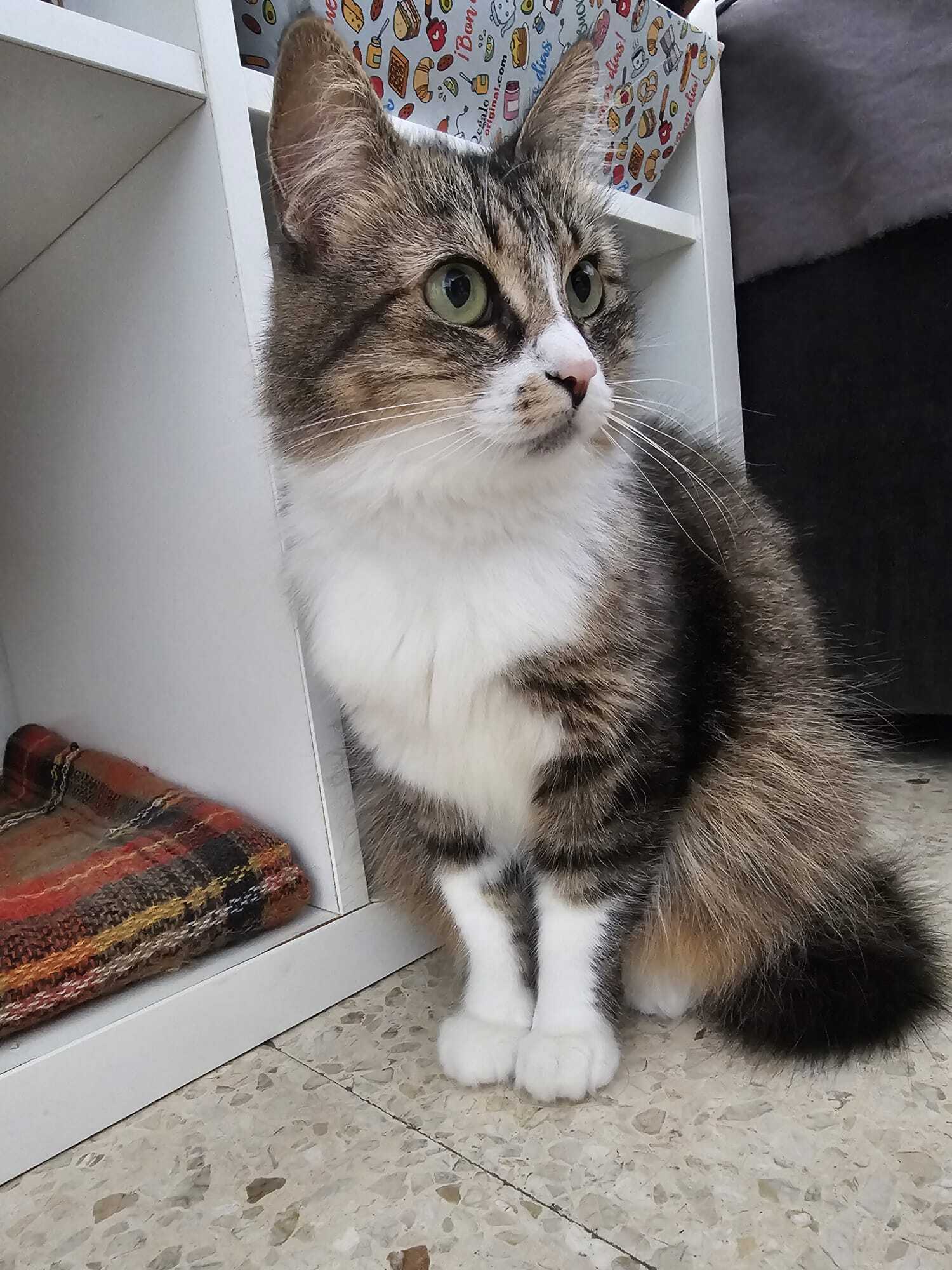 TAFFY es una gata de tamaño mediano, con pelaje atigrado gris y marrón, pecho y patitas blancas, y una cola muy esponjosa. Tiene ojos grandes de color verde y el hocico claro con la nariz rosada. Es una gata MUY MIEDOSA, no suele dejarse coger por desconocidos y probablemente se esconda si se siente amenazada. Sin embargo, cuando entra en confianza es MUY CARIÑOSA. Desapareció el JUEVES, cuando salió de casa, algo muy raro que no suele hacer por miedo (en la CALLE HEROS, EN EL PUERTO) y NO REGRESÓ. Desde entonces la hemos estado buscando y llamando por los alrededores, pero no ha aparecido. Creemos que puede estar ASUSTADA Y ESCONDIDA en algun lugar, ya que tiende a esconderse muy bien