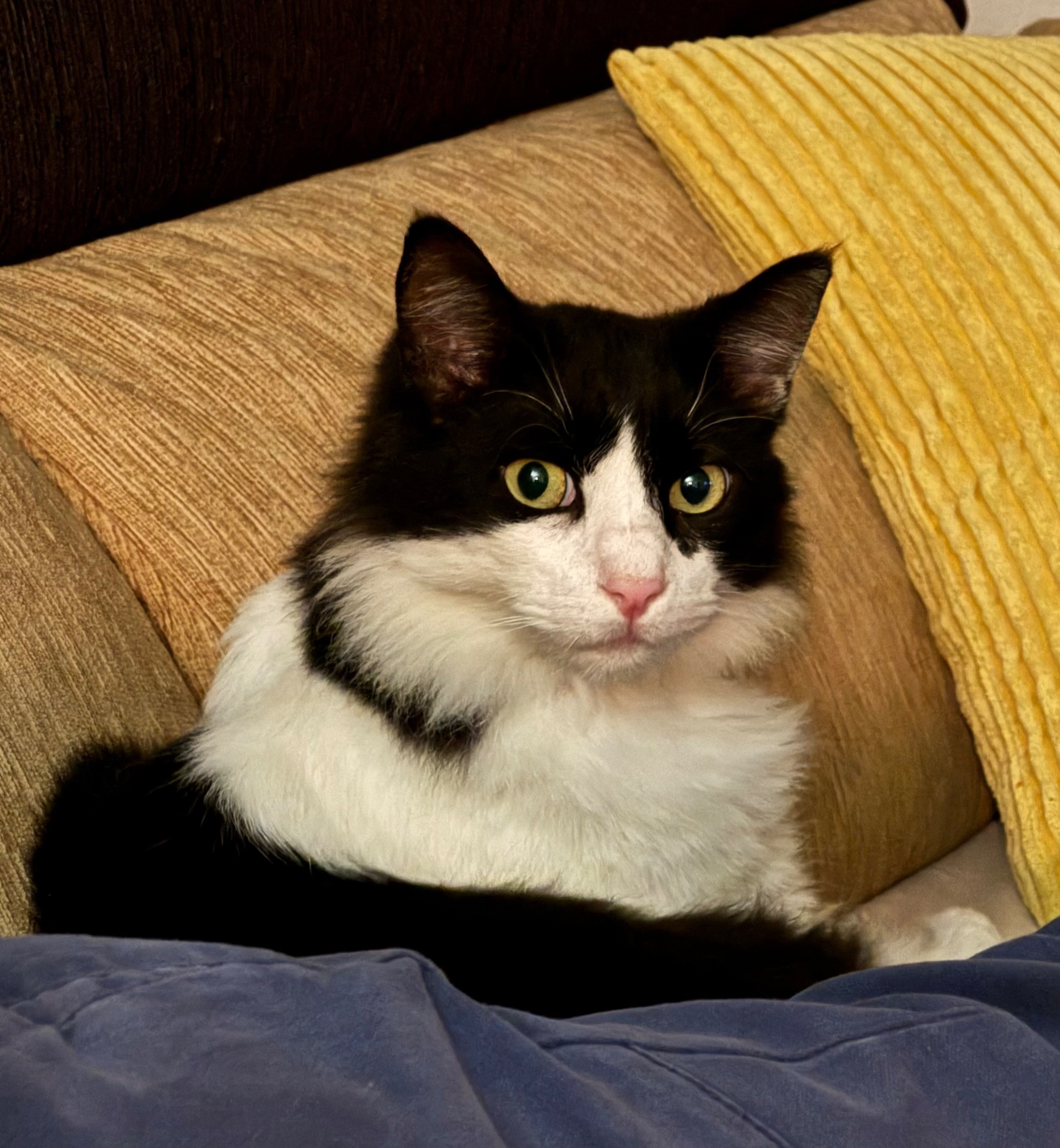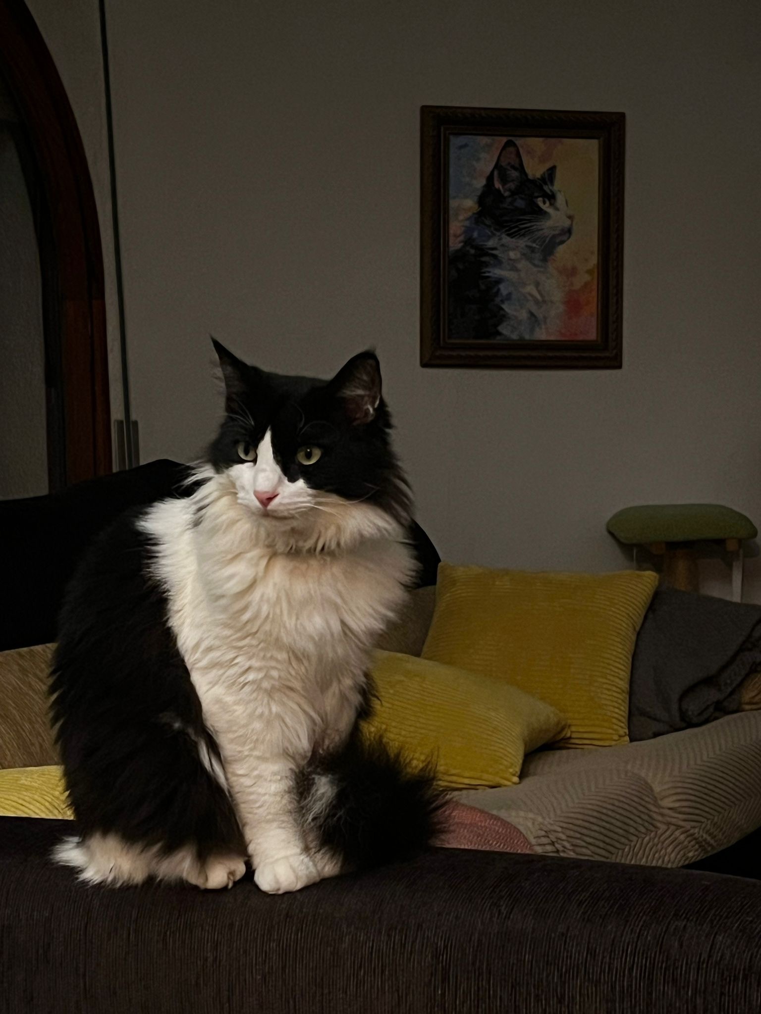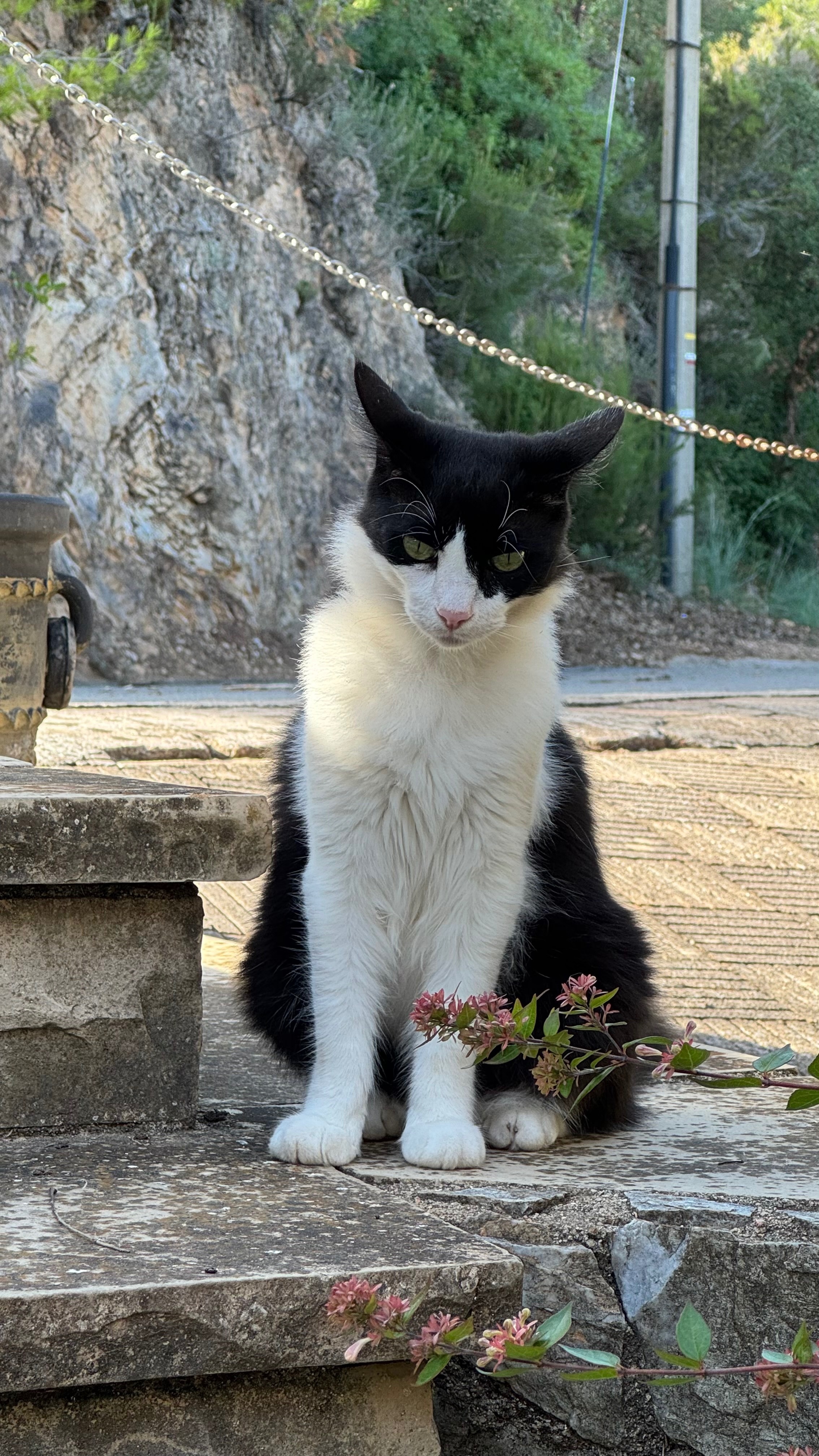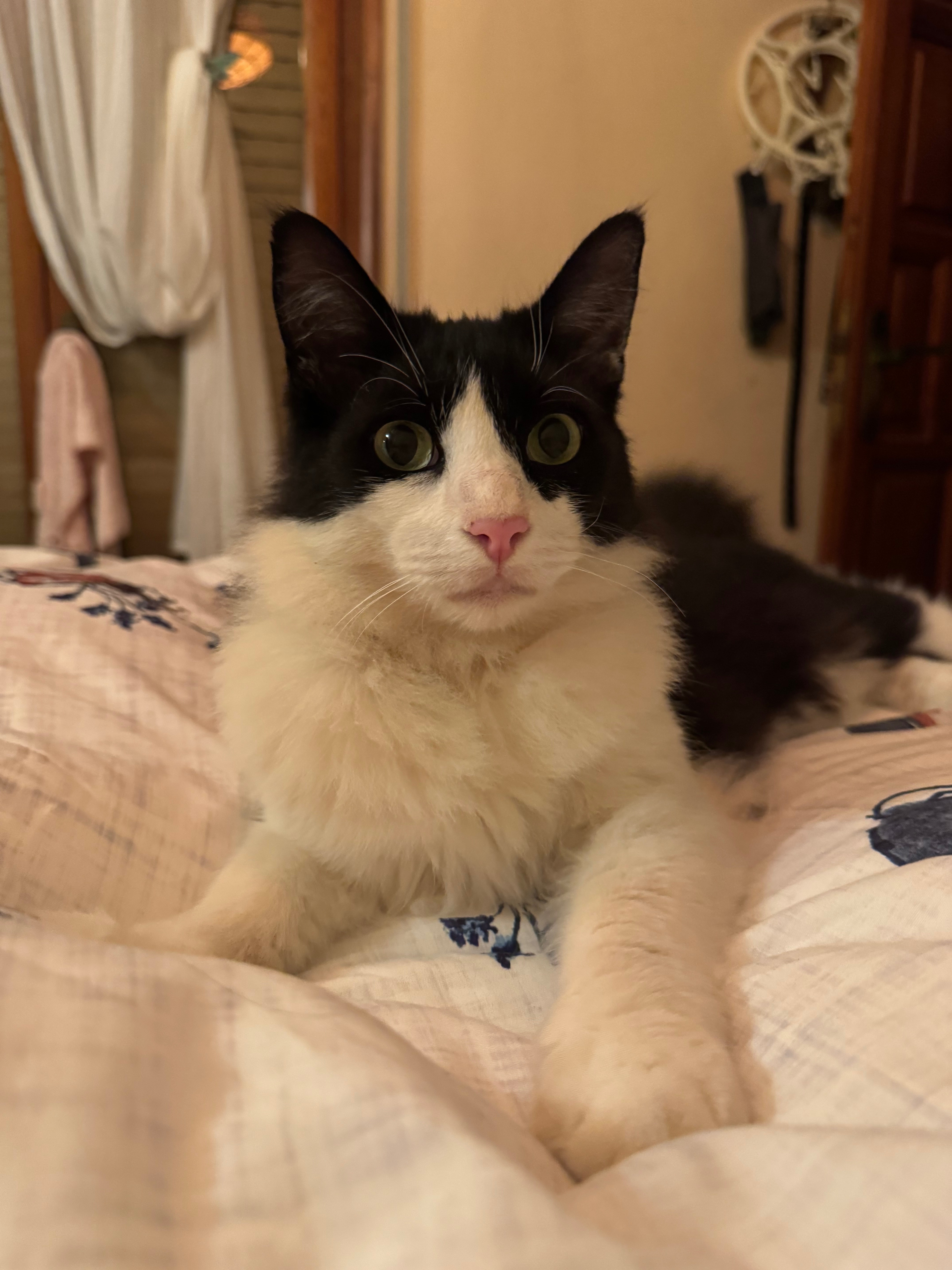 Micio es un gato blanco y negro (como se ve en la foto) con las siguientes características distintivas: • Tiene una cola esponjosa con la punta blanca. • Lleva un collar azul claro. Si ve o ha visto a Micio cerca de su casa, por favor, llame inmediatamente. NÚMERO DE CONTACTO: 650419895