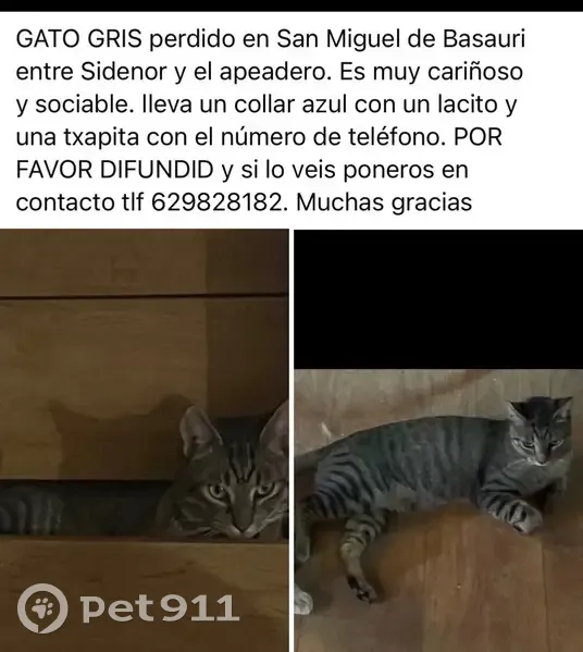Gato gris con rayas negras. Cuerpo largo y delgado. Ojos grandes verdes. Tiene chip y está castrado. Es muy sociable y muy cariñoso.