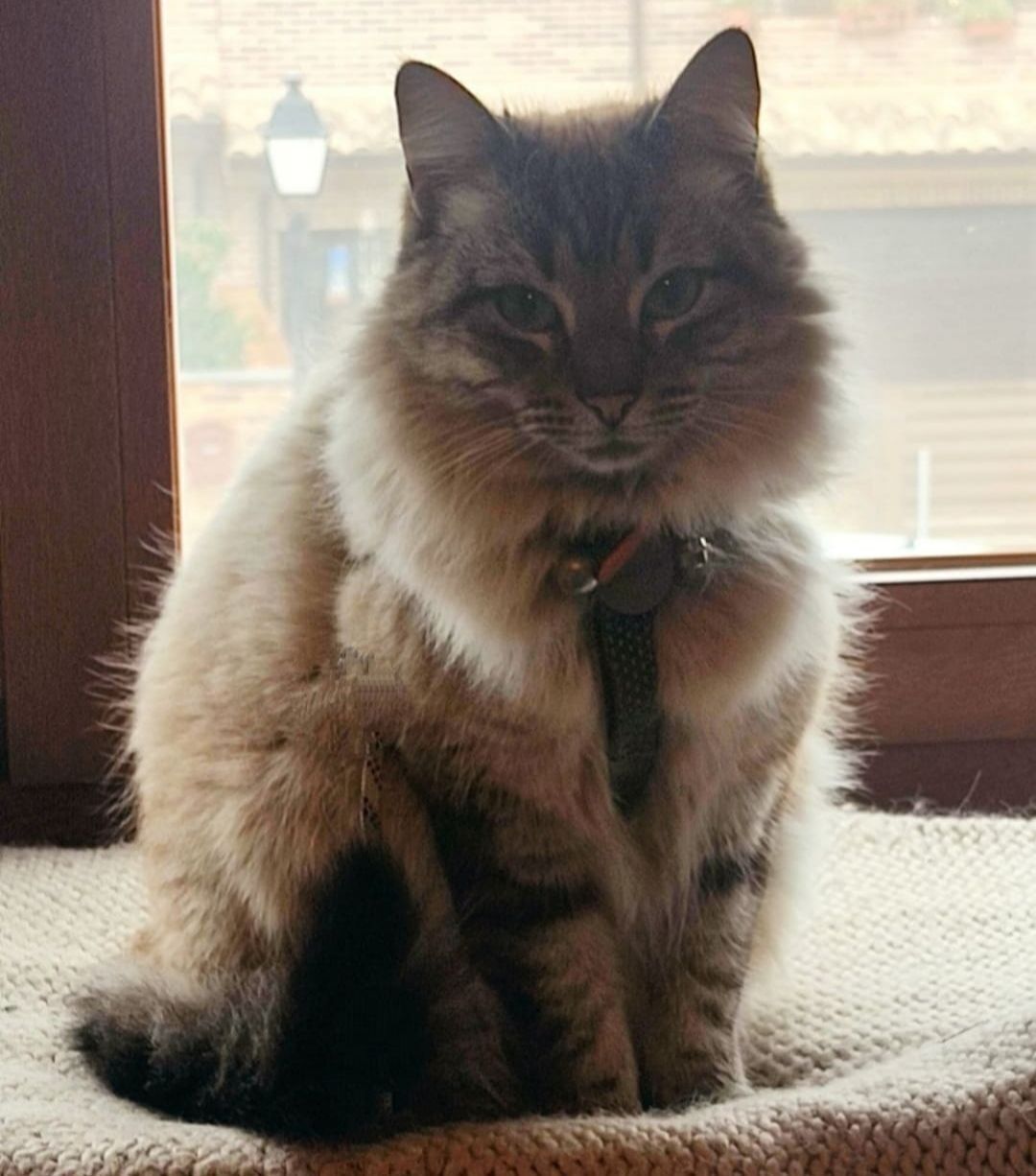Color gris y blanco. Ojos azules. Llevaba collar naranja con cascabel y chapa identificativa. Lleva chip. Salió por el patio el viernes y no volvió