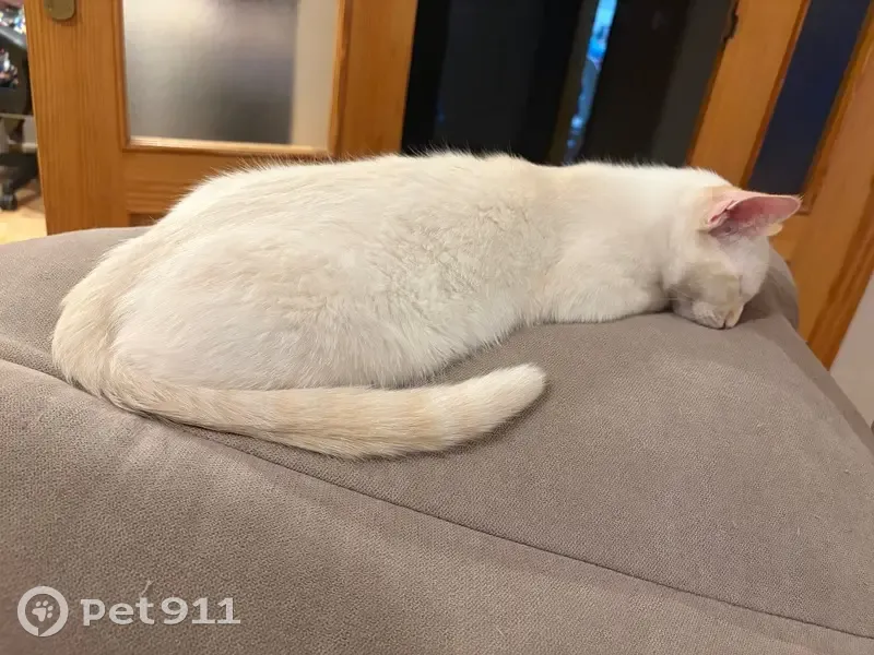 Se debió de salir sin darnos cuenta cuando entrábamos en casa. Nunca ha salido a la calle. Tiene 7 meses, es macho es blanco, ojos azules y tiene al lado de la nariz manchas amarillentas, un poco disfuminado por la cara y el cuerpo. También en las patas al lado de sus huellas y el rabo le tiene a rayas