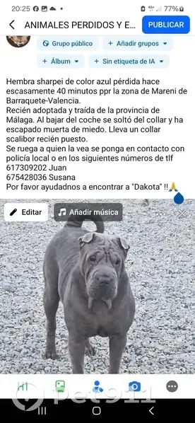 Hembra de 5 años , sharpei responde al nombre de Dakota o chichi,la acababa de adoptar en Málaga y al sacarla le puse el collar y se lo pues mal y salió corriendo