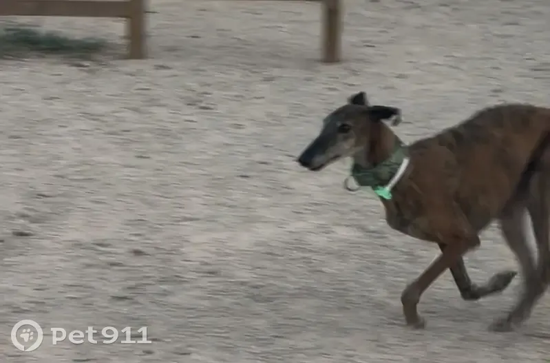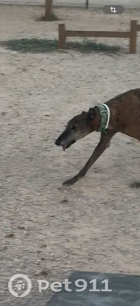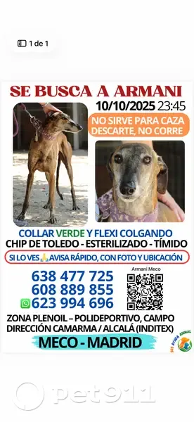 Es un perro que lleva la correa arrastras que le va asustando, pero luego realmente el perro le gusta estar con las personas y los animales se deja coger con mucho mimo no la fuerza llevo un collar verde con una chapa verde que debería de llevar el número de la asociación y un collar desparasitante de color blanco es bastante grande es un galgo bastante grande alto y con buenos músculos y un hocico bastante largo, jaspeado marrón y negro.
