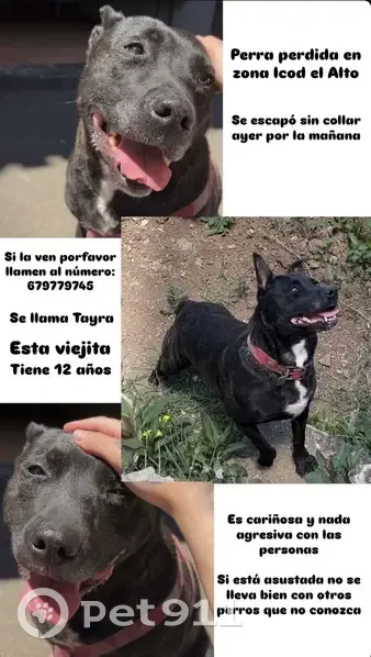 Una perra ya un poco viejita, con un par de canas por la cara, y con una oreja un poco doblada cuando las levanta. Desapareció por la mañana y por ahora nadie la ha visto.