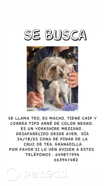 Es un yorkshire mediano, con la cabeza gris con marrón, y el lomo más oscuro. Tiene 7 años, no está castrado, tiene microchip y cuando se perdió llevaba un arnés de color negro. Es muy bueno y noble. Mi padre lo lleva todos los días a su finca junto con su otra perrita, cuando llegaron Teo se bajó rápidamente del coche, en esa zona suele estar suelto porque no hay tráfico es monte, va hace sus necesidades y vuelve… por eso cuando se bajó de coche así mi padre pensó que estaba apurado, a los 10 min. O menos empezó a llamarle y no regresó… desde entonces no paramos de buscarlo y y llamarle, y no tenemos noticias. Hemos puesto carteles por la población más cercana, Cruz de tea, en Granadilla , chimiche, en zona de pinos por los cazadores suelen aparcar sus coches… no tenemos noticias… Está denunciado en la policía, su veterinario también lo sabe, la gente que nos hemos encontrado también…