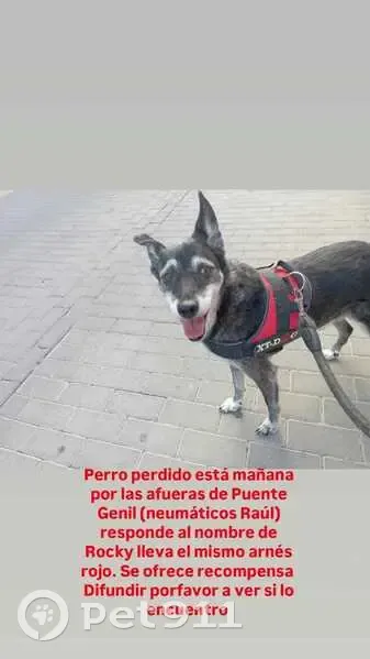 Hola, Mi perro se ha escapo de la finca donde estaba mientras sacaba el coche ayer sobre esta misma hora. Por la zona de Neumáticos Raúl, Responde al nombre de Rocky es muy bueno y cariñoso tiene 11 añitos y se reconoce porque tiene una oreja recta y la otra caída, es de color Negro con el pecho blanco. Lleva el mismo arnés rojo que se ve en la foto, Ofrezco recompensa. Difundir por favor