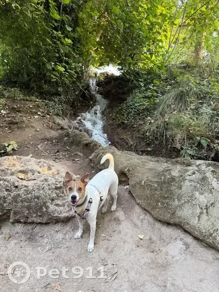 Perro Jack Russell pequeño de color blanco y cabeza marrón. Es asustadizo con desconocidos y debe estar desorientado porque lo han atropellado.